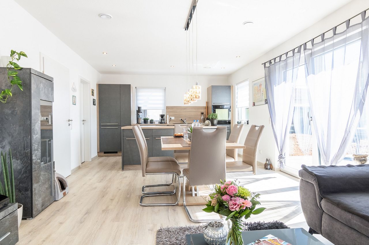 Das klassische 1,5-geschossige Einfamilienhaus mit Satteldach bietet Platz auf 130 m² Grundfläche. Der Wohnbereich wurde mit Fensterflächen und Terrassentüren an drei Seiten geplant, dadurch ist er hell und lichtdurchflutet. Über zwei große Terrassentüren geht es auf die herrliche Terrasse, die die Bauherren in Eigenregie geplant haben und zum Teil auch in Eigenleistung erstellt haben.