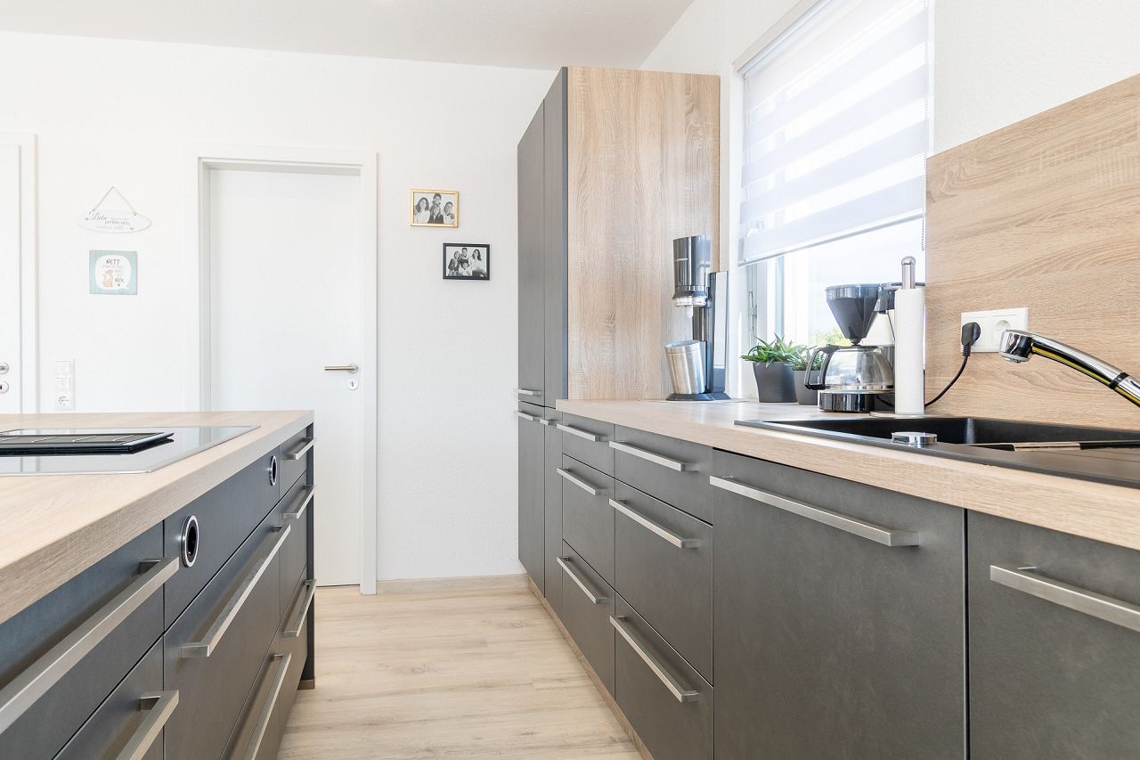 Bei der Grundrissgestaltung wünschte sich das Paar einen Wohn-/Essbereich mit offener Küchengestaltung und einer Kochinsel. Neben der Küche ist eine praktische Speisekammer angeordnet. Das sorgt für viel Stauraum und kurze Wege. Unterhalb der Treppe wurde ebenfalls Stauraum geschaffen, dahinter befindet sich der Hauswirtschafts-/Haustechnikraum. Die Anordnung ist sehr gut durchdacht und praktisch. Im Erdgeschoss befindet sich noch ein Gäste-WC. Das Dachgeschoss bietet Platz für ein Schlafzimmer mit Ankleidezimmer, ein Gästezimmer und ein großes Bad.