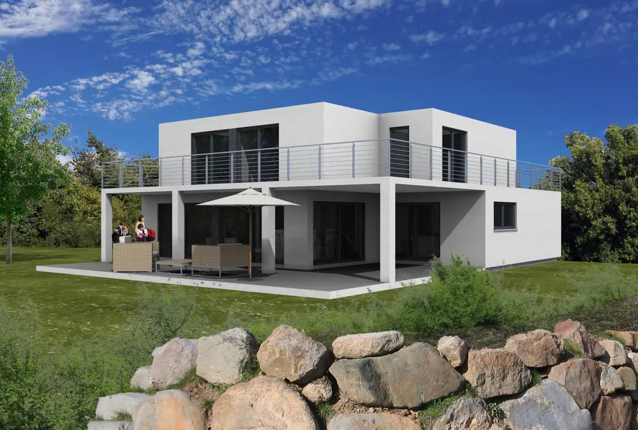 Das exklusive Fertighaus wurde im Bauhausstil mit einem Flachdach errichtet. An der Gartenseite wird es geprägt durch eine große Terrassenüberdachung mit aufgesetztem Balkon. Die großen Panorama-Hebeschiebetüren öffnen das Haus auf exklusive Weise. An der Frontseite bietet die Architektur zwei Gebäudeversätze, einen überdachten Eingangsbereich und eine Zufahrt in ein Kellergeschoss mit Garagen.