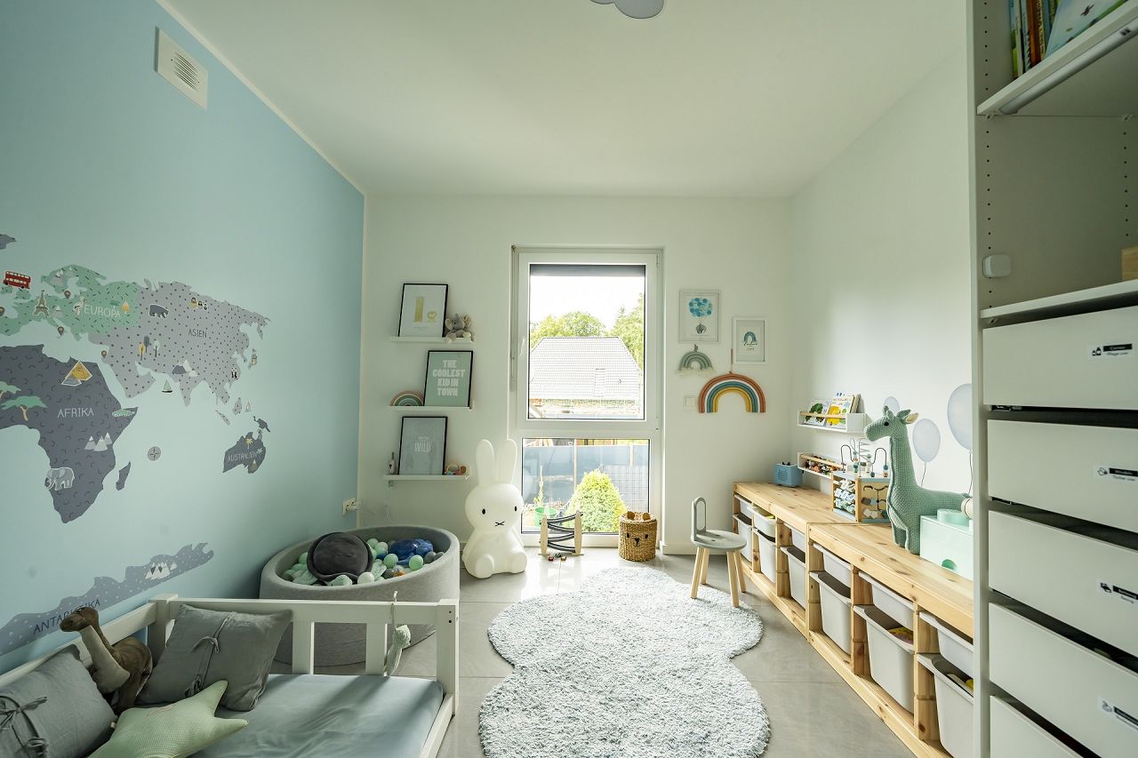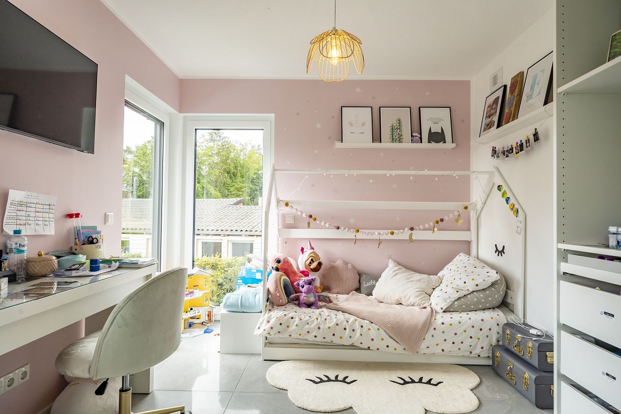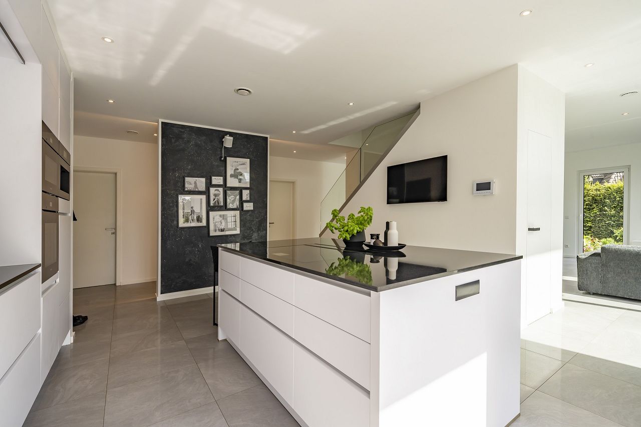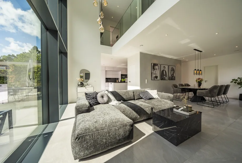Die Küche ist ein Kochtraum mit einer großen Kochinsel und sehr viel Platz. Außerdem bietet sie einen direkten Zugang zur Terrasse und kurze Wege für das Essen im Freien und das Feiern mit Freunden. Der großzügige Wohn- und Essbereich lädt zu jeder Jahreszeit zum stilvollen Miteinander ein. Das Mobiliar, die Lampen, die Bildauswahl und die dekorativen Details fügen sich perfekt zum edlen Wohnstil der Familie zusammen und ergeben eine beeindruckende Gesamtinszenierung. Auch das Obergeschoss wird von der Glasfront und der Galerie in Szene gesetzt. Die liebevoll eingerichteten Kinderzimmer bieten ein behagliches Wohlfühlambiente. Auch das Bad, der Elternschlafbereich und die Ankleide sind geschmackvoll in Anthrazit und Weiß gestaltet.