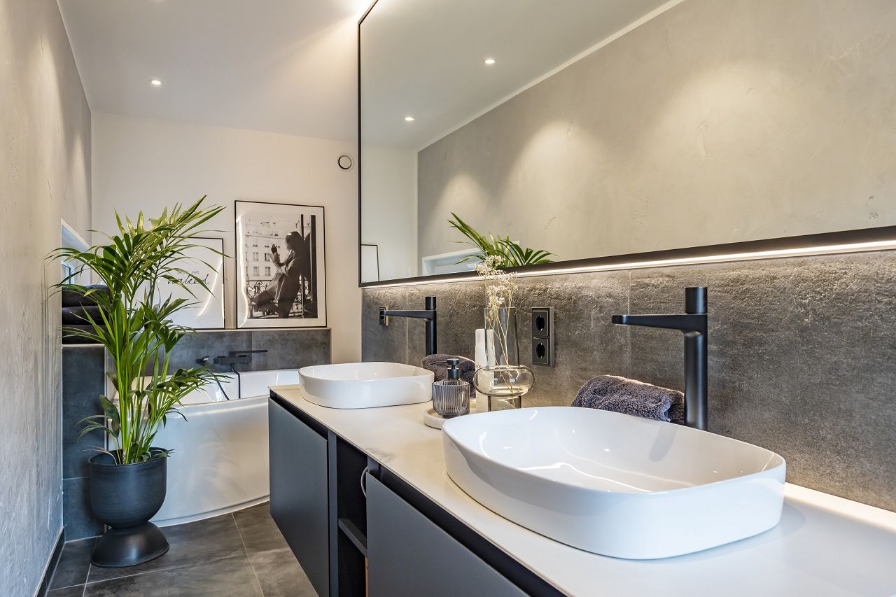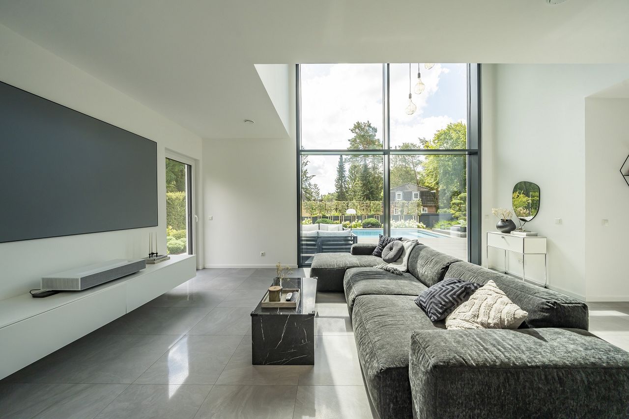 Der gesamte Gartenbereich mit Pool strahlt südländisches Flair aus und macht das Zuhause zum Wohlfühl- und Erholungsmittelpunkt der Familie. Das gesamte Luxushaus wurde von der Familie stilvoll ausgestattet und eingerichtet. Die Farben, die den Stil unterstreichen sind eher kühl und clean gewählt in Weiß, Grau und Schwarz.