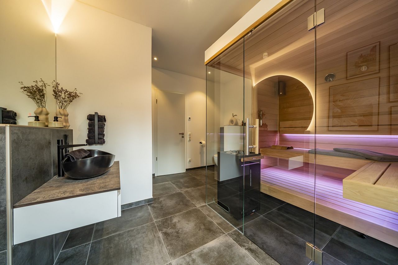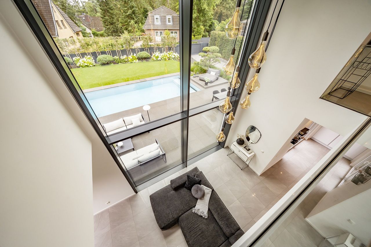 Auf 64 m² ist der Wohn-/Ess- und Kochbereich komfortabel angeordnet. Oberhalb des Wohnbereiches erstreckt sich die Glasfront als Galerie zweigeschossig bis zum Obergeschoss und vermittelt ein imposantes Raumgefühl. Der Wohn-/Ess- und Kochbereich ist übereck angeordnet. Das schöne Duschbad mit Sauna, verfügt über eine Terrassentür und bietet somit auch einen direkten Zugang zum Pool. Der Hauswirtschafts-/Haustechnikraum und eine Speisekammer komplettieren die Grundrissgestaltung im Erdgeschoss.