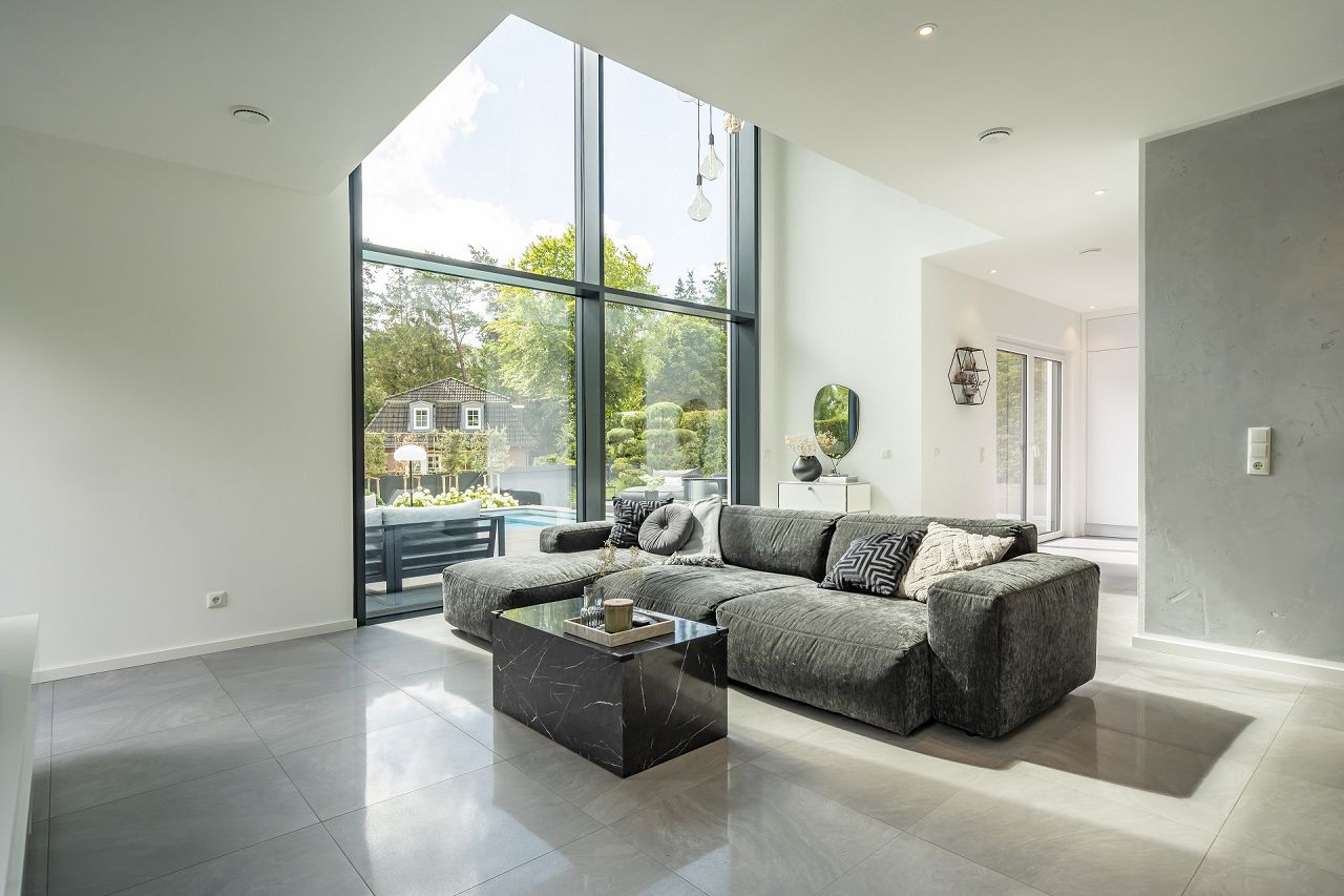 Auf einer Nettoraumfläche von 182 m² hat sich die Baufamilie ihren Traum vom Luxusfertighaus im Bauhausstil mit dem Fertighaushersteller STREIF erfüllt. An der Gartenseite zum Pool hin, wartet das Luxushaus in der Architektur mit einer beeindruckenden Glasfront auf. Charmante weitere Details sind Übereckfenster, große Terrassentüren, eine Dachterrasse, eine Galerie und eine Doppelgarage mit direktem Zugang zum Haus.