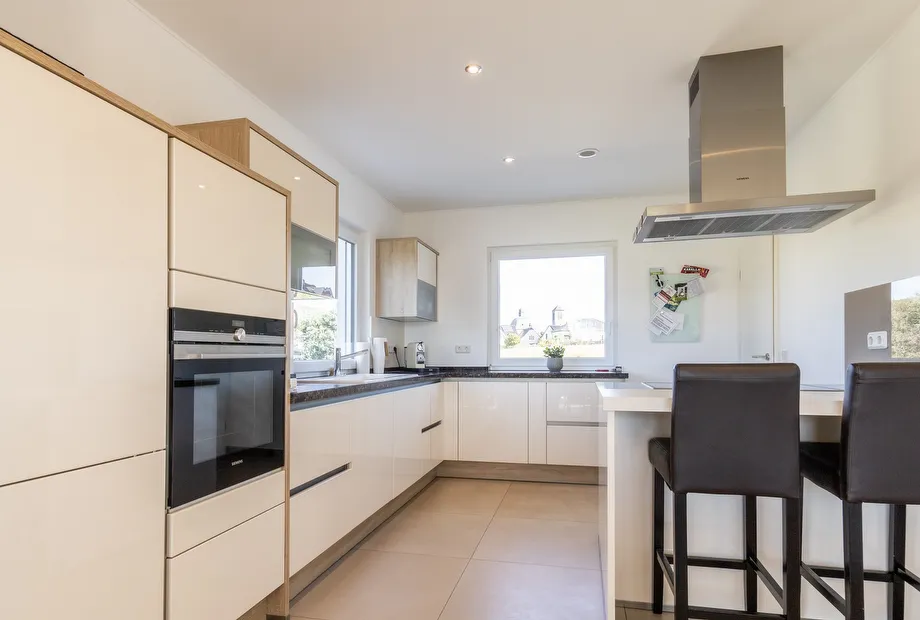 Frau Gilles hat ihr Zuhause mit viel Geschmack ausgestattet und möbliert. Das mediterrane Landhaus wurde mit einem großen Wohn-/Esszimmer geplant. Die moderne Küche ist übereck angeordnet, sie ist offen gestaltet, aber vom Wohnbereich nicht direkt einsehbar. Im Erdgeschoss befinden sich noch ein Gäste-WC, der Hauswirtschafts- und Haustechnikraum und die Diele. Die Diele wurde mit einer geradläufigen Treppe gestaltet, die ins Obergeschoss führt. Im Obergeschoss befinden sich ein Gäste- und ein Arbeitszimmer sowie das Schlafzimmer von Frau Gilles mit Ankleidebereich und Bad en suite. Das Bad wurde aus einer Kombination von Mosaik- und Holzfliesen stilvoll ausgestaltet.