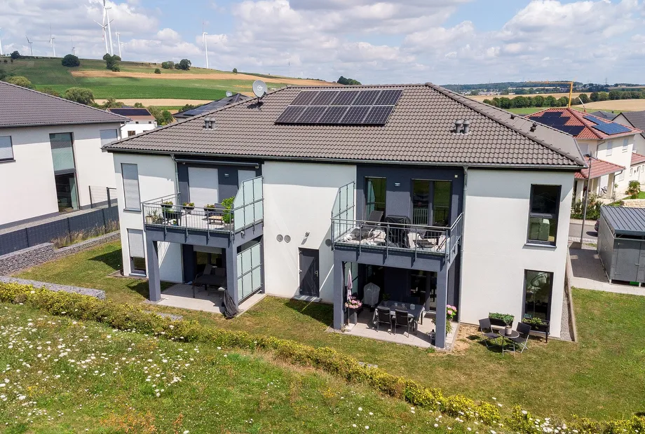Die Architektur des Mehrfamilienhauses wird durch ein Walmdach geprägt. Im Erd- und im Obergeschoss wurden jeweils doppelflügelige bodentiefe Terrassentüren zum Teil übereck geplant. Das gibt dem Gebäude ein elegantes und modernes Aussehen. Die Frontseite des Mehrfamilienhauses wird durch einen zurückgezogenen Hauseingang, der zusätzlich anthrazitfarben gestaltet ist, optisch in Szene gesetzt. Im Obergeschoss sind die bodentiefen Fenster mit einer festverglasten Brüstung ausgeführt. Sehr gut durchdacht ist auch der Hauseingangsbereich, der direkt mit einer seitlichen Rampe versehen ist, sodass mit Kinderwagen, Rollator oder Rollstuhl das Gebäude barrierefrei betreten werden kann. Die Gartenseite wird von den Standbalkonen optisch aufgewertet. Hier ist für jede der vier Wohnungen ein schöner Rückzugsbereich mit einer überdachten Terrasse oder einem Balkon entstanden. Jede Terrasse und jeder Balkon ist auch noch einmal seitlich zur Nachbarwohnung mit einem Sichtschutz aus VSG-Sicherheitsglas ausgeführt und ist am Austritt mit einer barrierearmen Flachschwelle versehen. Jeder Wohnbereich wird von fünf bodentiefen Fensterelementen vom Tageslicht verwöhnt.