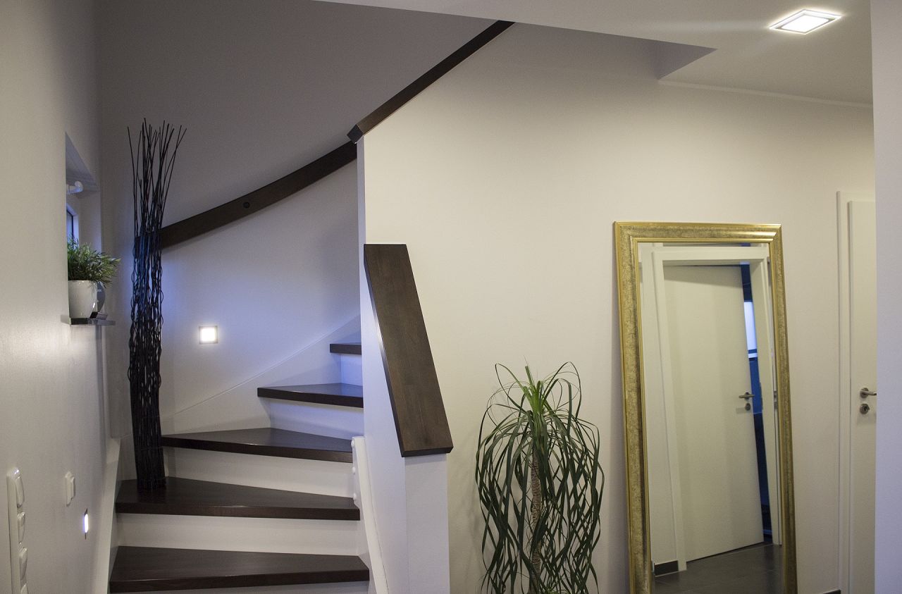 In der Raumgestaltung findet sich das Farbthema Grau-Weiß ebenfalls wieder. XXL-große dunkelgraue Fliesen, weiße Zimmertüren und weiße Fenster bilden den Rahmen für ein modernes Styling. Die offene Küche wurde modern ausgestattet. Als besonderen Eyecatcher wurde im Bad ein Ambilight-System installiert. Eine weitere Besonderheit ist die Holztreppe, deren Konstruktion in weiß lackierter Ausführung gewählt wurde in der Kombination mit dunklen Trittstufen.