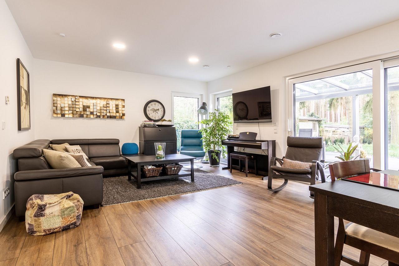 Der große, offen gestaltete Wohn-/Ess- und Kochbereich bietet von drei Seiten einen herrlichen Blick in den wunderschönen Garten mit dem alten Baumbestand. Die Panoramafenster bringen viel Licht und die Natur ins Haus. Das Haus wurde von Familie Voigt im klassischen Kolonialstil mit dunklen Möbeln und vielen Pflanzen ausgestattet. Die Anordnung der Fenster in der Küche wurde nachdem die Küche fertig geplant war, noch einmal angepasst. Die Familie hat ihr Domizil mit dunklen Möbeln und viel Pflanzen wohnlich gestaltet. Im Erdgeschoss befinden sich weiterhin ein Gästezimmer und ein Gästebad, eine separate Speisekammer gegenüber der Küche und ein Hauswirtschafts- und Haustechnikraum.