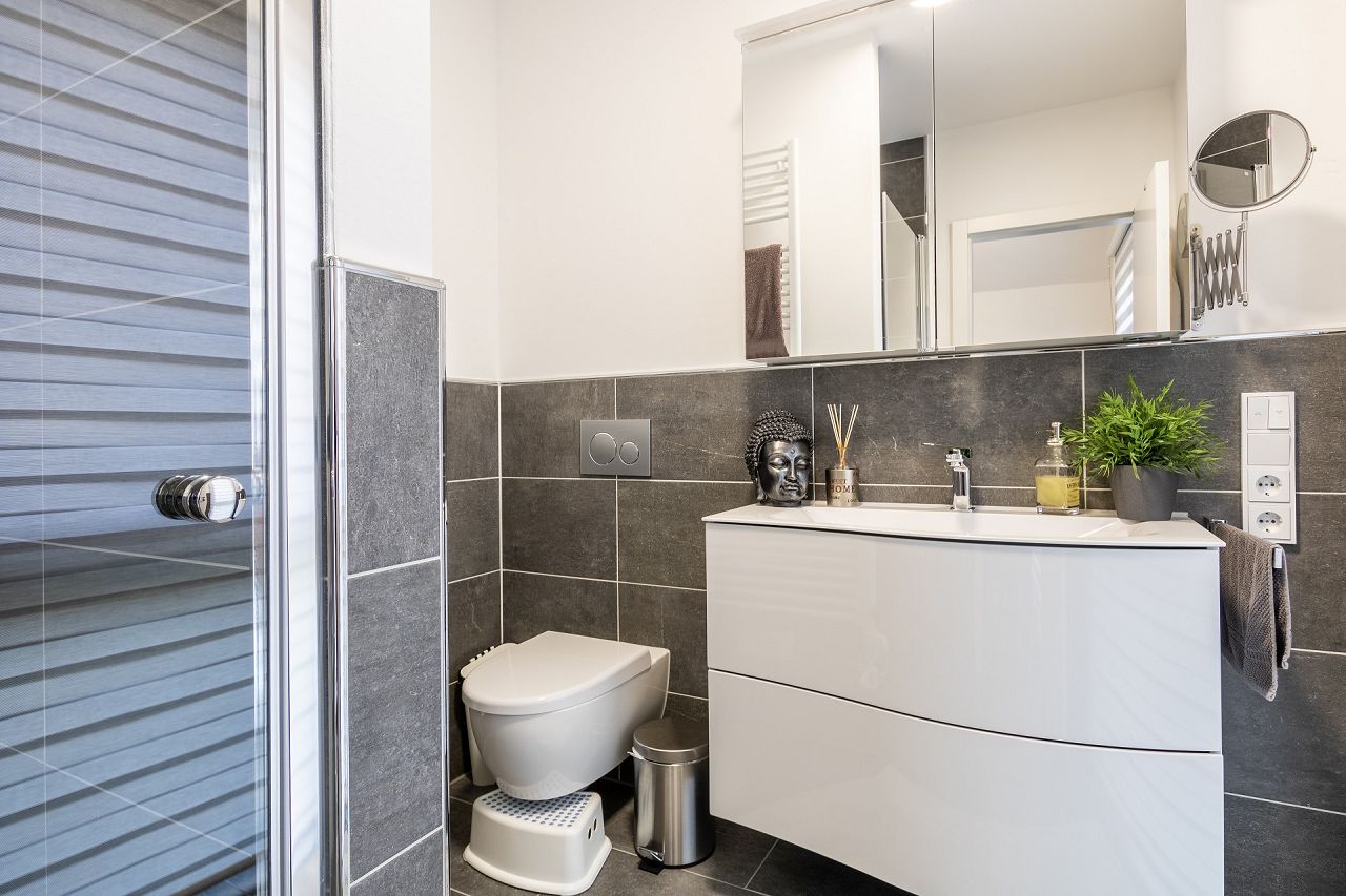 Bereits der erste Kontakt mit der STREIF-Bauberaterin war ausschlaggebend. „Sie hat sich viel Zeit für uns genommen, sich sehr intensiv mit der Umsetzung unserer Bauwünsche beschäftigt und viele gute Ideen für die Ausgestaltung unseres Hauses eingebracht“, berichtet die Bauherrin. So wurde zum Beispiel ein Vorratsraum für die Küche eingeplant und die Duschen wurden mit einer gemauerten Sitzbank ausgestattet. Für die Garderobe wurde eine Nische eingeplant, sodass der Flurbereich frei genutzt werden kann.