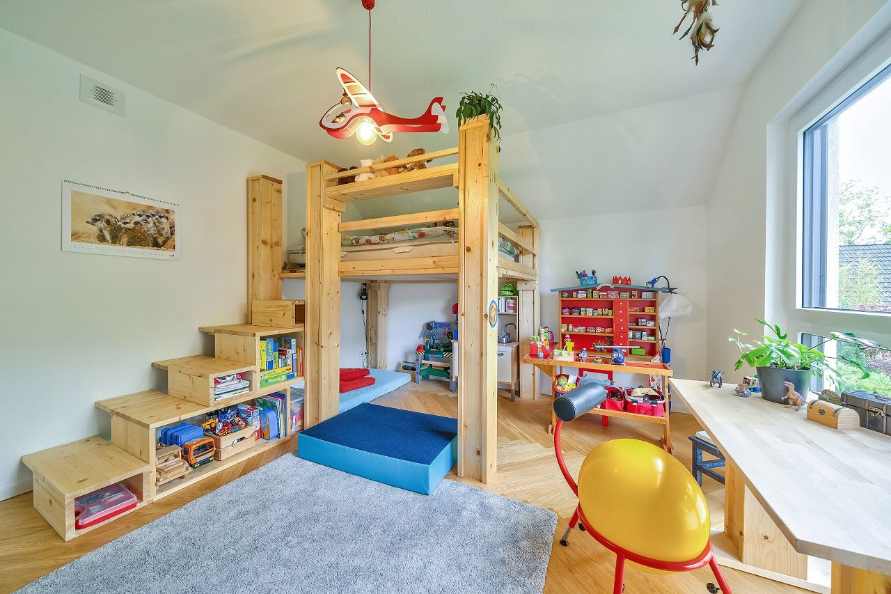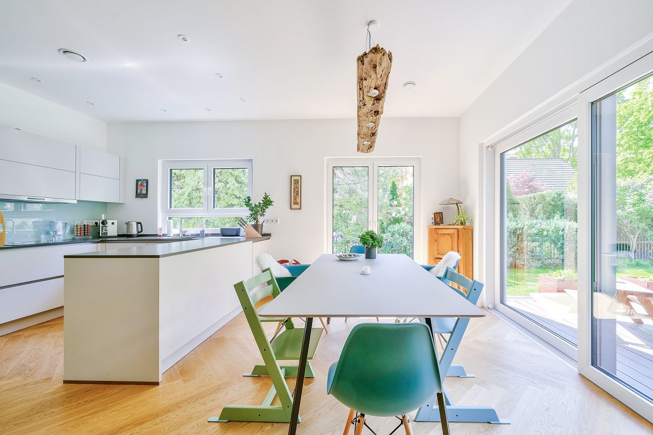 Auf großzügigen 44 m² wurde der Wohn-/Ess- und Kochbereich von Familie Beckmann realisiert. Im Erdgeschoss befinden sich weiterhin ein Duschbad, ein Hauswirtschafts-/Haustechnikraum und ein zusätzlicher Raum für ein Arbeits-/Gästezimmer. Der Flurbereich ist offen zum Wohnbereich gestaltet. Im Dachgeschoss befinden sich zwei gleich große Kinderzimmer, ein familienfreundliches Bad und der Elternschlafbereich mit Ankleide.