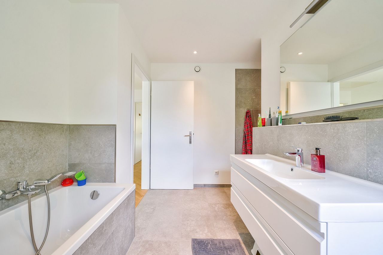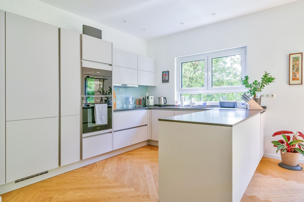 Familie Beckmann hat ihr Zuhause stilvoll ausgestattet und eingerichtet. Eine klare Linienführung sorgt für ein beruhigendes Ambiente. Der Fußboden in Fischgrät-Parkett in der Holzart Eiche im XXL-Format verleiht dem gesamten Wohnbereich eine behagliche Atmosphäre. Eine Kombination aus antiken Möbeln und Designklassikern bringt die Individualität der Familie zum Ausdruck. Für die Bäder wurden Bodenfliesen in Betonoptik ausgewählt. Sie sehen nicht nur gut aus, sie sind auch besonders pflegeleicht. Die Fenster, Zimmertüren und die Wandgestaltung in Weiß bilden den perfekten Rahmen für das Styling.