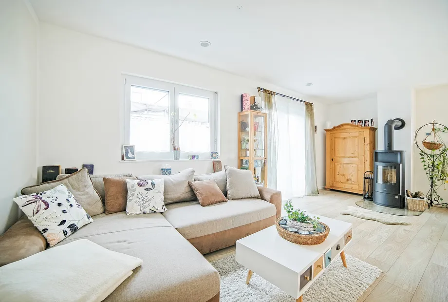 Im Erdgeschoss befindet sich der mit 45 m² großzügige Wohn-/ und Essbereich mit offen gestalteter Küche. Hier hält sich Familie Miceli am liebsten auf. Möbliert wurde das Reihenendhaus von Baufamilie Miceli im schicken Retro-Look. Die Kunststoffschalenstühle im Essbereich sind stylisch und pflegeleicht zugleich. Der strapazierfähige Vinylboden in Holzoptik unterstreicht das gemütliche Ambiente. Weiße Türen, Wände, Gardinen und Küchenmöbel bieten den perfekten Rahmen für ein helles und lichtes Raumgefühl. Durch ein halbhohes Wandelement wird eine gemütliche Fernsehecke gebildet. Den Wunsch nach einem Kaminofen hat sich Baufamilie Miceli ebenfalls erfüllt. Der Küchenbereich in L-Form mit Kochinsel bietet viel Abstell-/ und Arbeitsfläche. Gleichzeitig sind genügend Schränke für alle Küchenutensilien vorhanden.