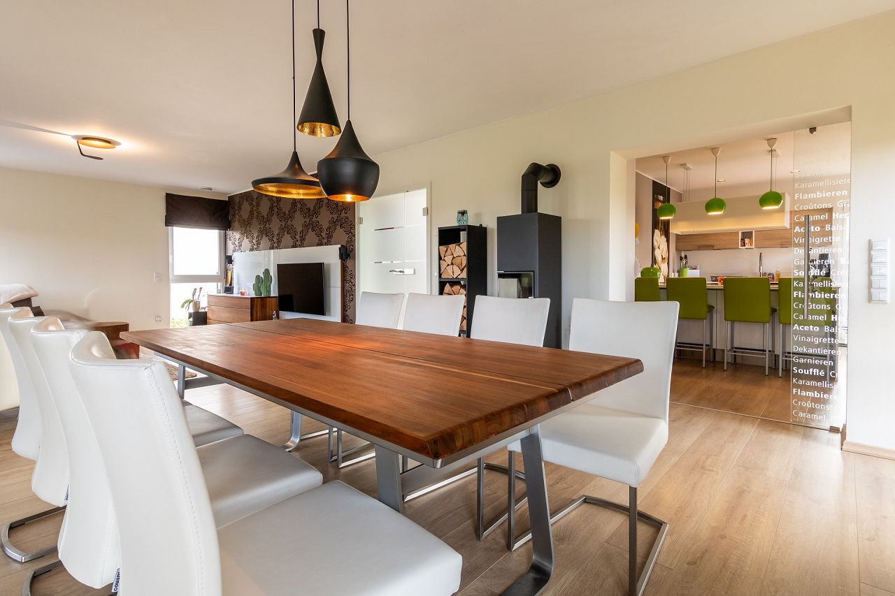 Diesen Haustraum einer modernen Stadtvilla mit einer schönen Terrasse und einem großen Garten hat sich Familie Geiger-Coenjaerts erfüllt. Der Küchentraum der Familie wurde in einem Übereck-Erker realisiert mit Kochtheke, einer Schrankwand mit integriertem Backofen, Dampfgarer und Kühlschrank, Übereckfenstern und einer Glasschiebetür zum großzügigen Ess- und Wohnbereich. Der gesamte Wohnbereich öffnet sich über sechs Terrassentüren zur Terrasse und zum Garten hin. Der Eingangsbereich ist mit einer Galerie im Obergeschoss realisiert und ebenfalls großzügig gestaltet. Besonders wichtig war es der Familie, dass die Haustechnik und der Hauswirtschaftsraum im Kellergeschoss untergebracht sind und dort auch noch viel Stauraum zur Verfügung steht.