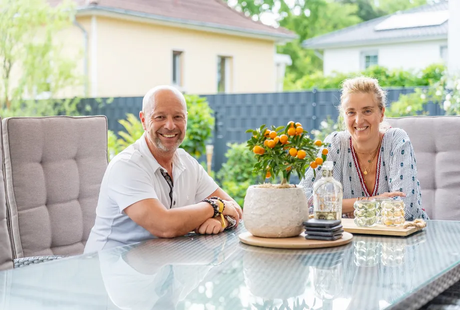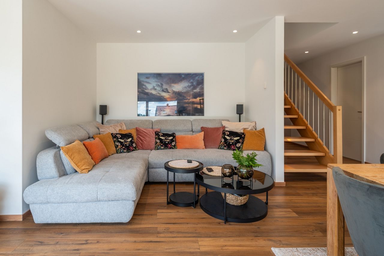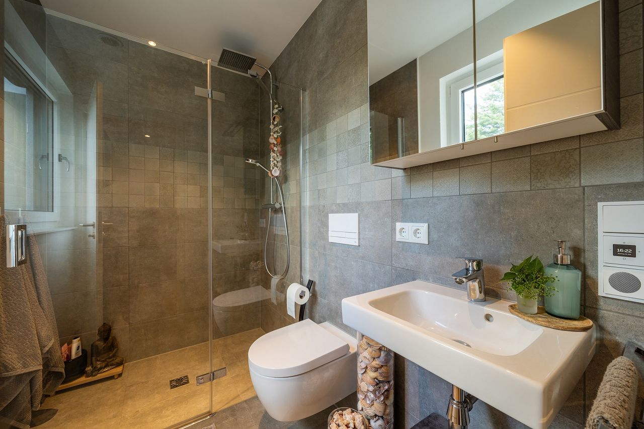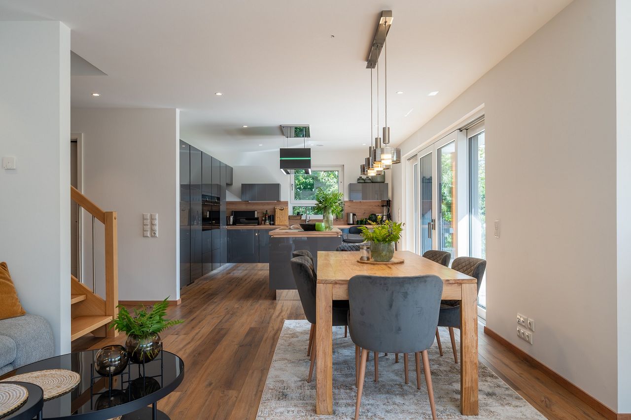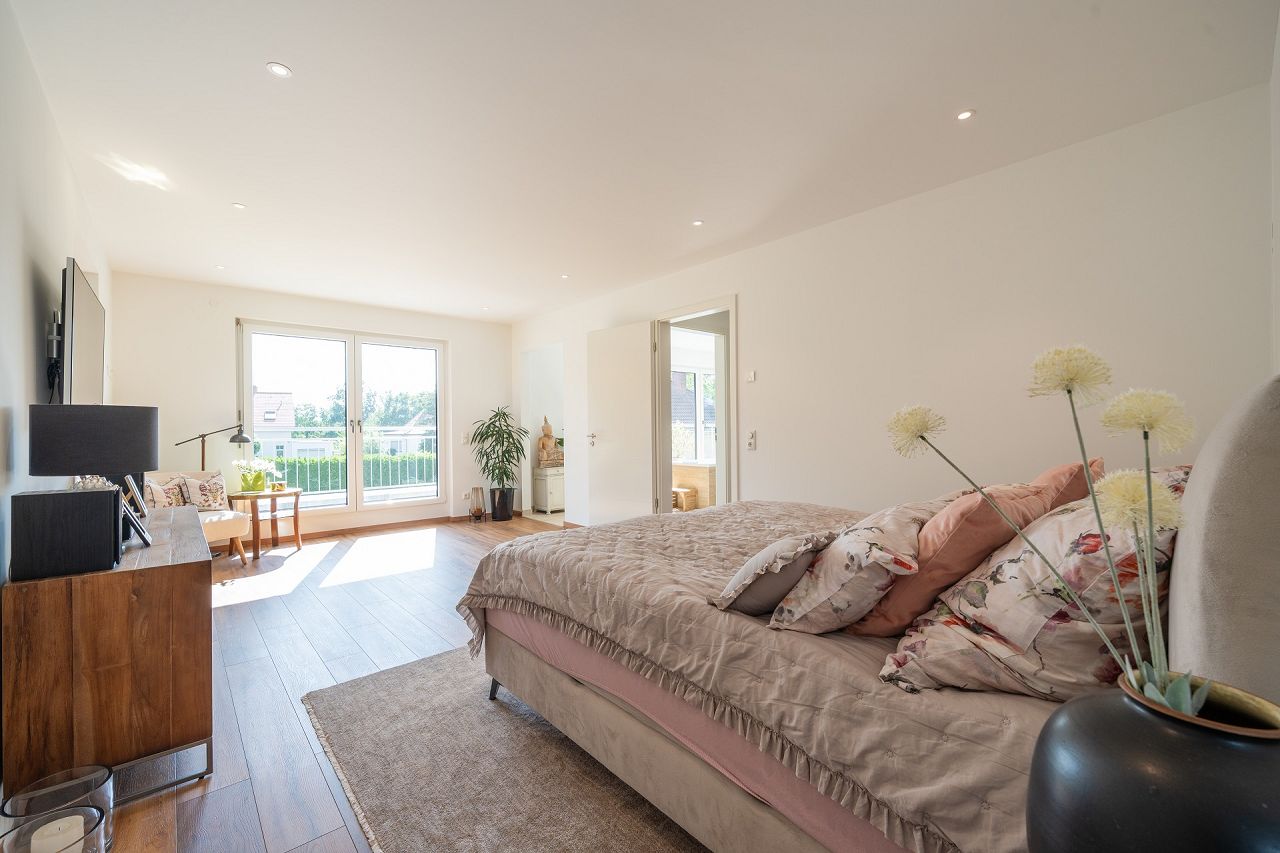 Das Interieur und die Ausstattung von Familie Ludwig strahlen moderne Behaglichkeit aus. Die Fenster-, Terrassentüren und Panorama-Hebeschiebetüren sind außen in Anthrazit und innen in Weiß ausgeführt. Der schöne markante Holzdielenboden, der im Erdgeschoss und im Obergeschoss verlegt wurde, bietet eine perfekte Grundlage für die weißen Fenster, weißen Zimmertüren und eine helle Wandgestaltung. Farbige Akzente setzen Sofakissen in Zimt und Orange. Eine Küche in Grau mit Holzakzenten passt perfekt zum Essbereich, der mit grauen Sesseln und einem schönen Holztisch einlädt. Der Empfangsbereich ist mit Antiquitäten arrangiert, die ihm eine besondere Wirkung verleihen. Im Obergeschoss ist das Badezimmer ein absolutes Highlight. Bei der STREIF-Ausbaustufe fast fertig plus, ist die Ausstattung der Bäder mit Fliesen und Sanitärobjekten inklusive. Das Traumbad bietet mit 17,21 m² viel Platz für die Realisierung der Wünsche. Die mittig freistehende Badewanne präsentiert sich wie ein Star auf einer Bühne, und wird von vier Terrassentüren übereck angestrahlt. Die ausgewählten sandfarbenen Fliesen wirken edel und anmutig. Die große Dusche ist mit einer gemauerten Sitzbank ausgeführt. Ein seitlicher Spritzschutz aus Glas ist transparent und lässt das Bad noch großzügiger erscheinen. Die Toilette „versteckt sich“ geschickt hinter einem Raumversatz. Der Master-Bedroom mit Ankleide bietet Komfort auf 32 m². Traumbad und Master-Bedroom sind mit einer Schiebetür verbunden.