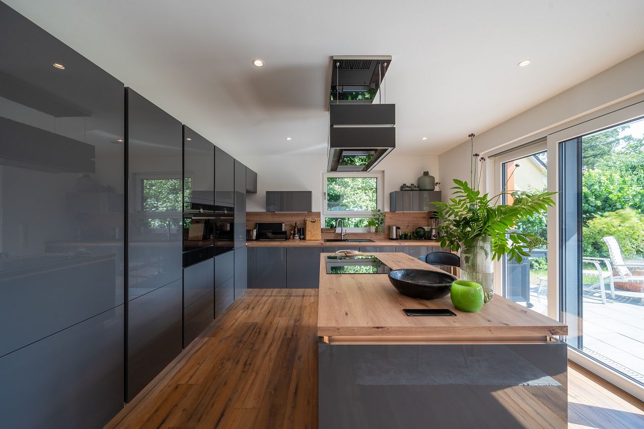 Die Architektur der Stadtvilla von Familie Ludwig wird von einem Übereckerker und einem Walmdach geprägt. Der Übereckerker ist mit einer schönen Fassadenverkleidung aus Holz akzentuiert. Die Gartenseite ist im Erdgeschoss und im Obergeschoss mit vielen Panorama-Hebeschiebetüren ausgeführt, die das gesamte Haus mit Tageslicht fluten. Das schicke Haustürvordach schützt nicht nur die Hausbesitzer und die Gäste gleichermaßen, es bietet auch einen Blickfang an der Frontseite des Hauses. Für die Gestaltung des Hauses ebenfalls wichtig ist der Balkon, der dem Übereckerker aufgesetzt ist und zum Teil auch die Terrasse überdacht. Der Dachüberstand ist in der Farbe der Dacheindeckung in Anthrazitgrau mit integrierter Beleuchtung ausgeführt. Die Vorbau-Rollladen sind ebenfalls in Anthrazitgrau ausgeführt.