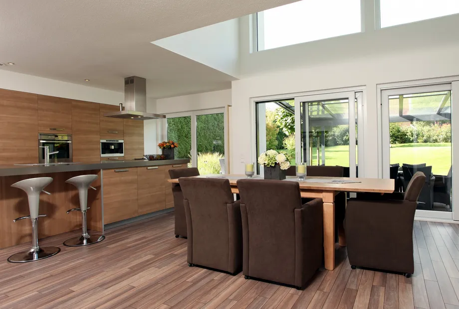 Der Küchen- und Essbereich bietet mit 34 m² viel Platz zum Kochen und Essen. Die Küchenzeile wurde flächenbündig in die Wand eingebaut. Eine Kochinsel mit Theke ermöglicht das gemütliche, gemeinsame Kochen und sorgt für Blickkontakt mit der Familie und Gästen. Der Massivholz-Esstisch mit den Rattanstühlen strahlt ein behagliches Ambiente aus. Der Essbereich öffnet sich durch einen Luftraum zur Galerie im Obergeschoss und verstärkt die Großzügigkeit des Raumgefühls.