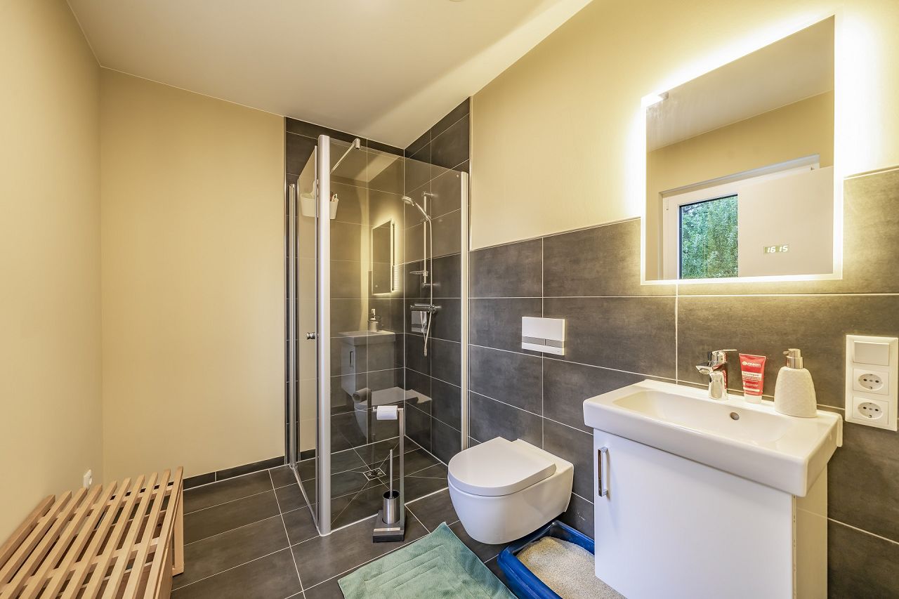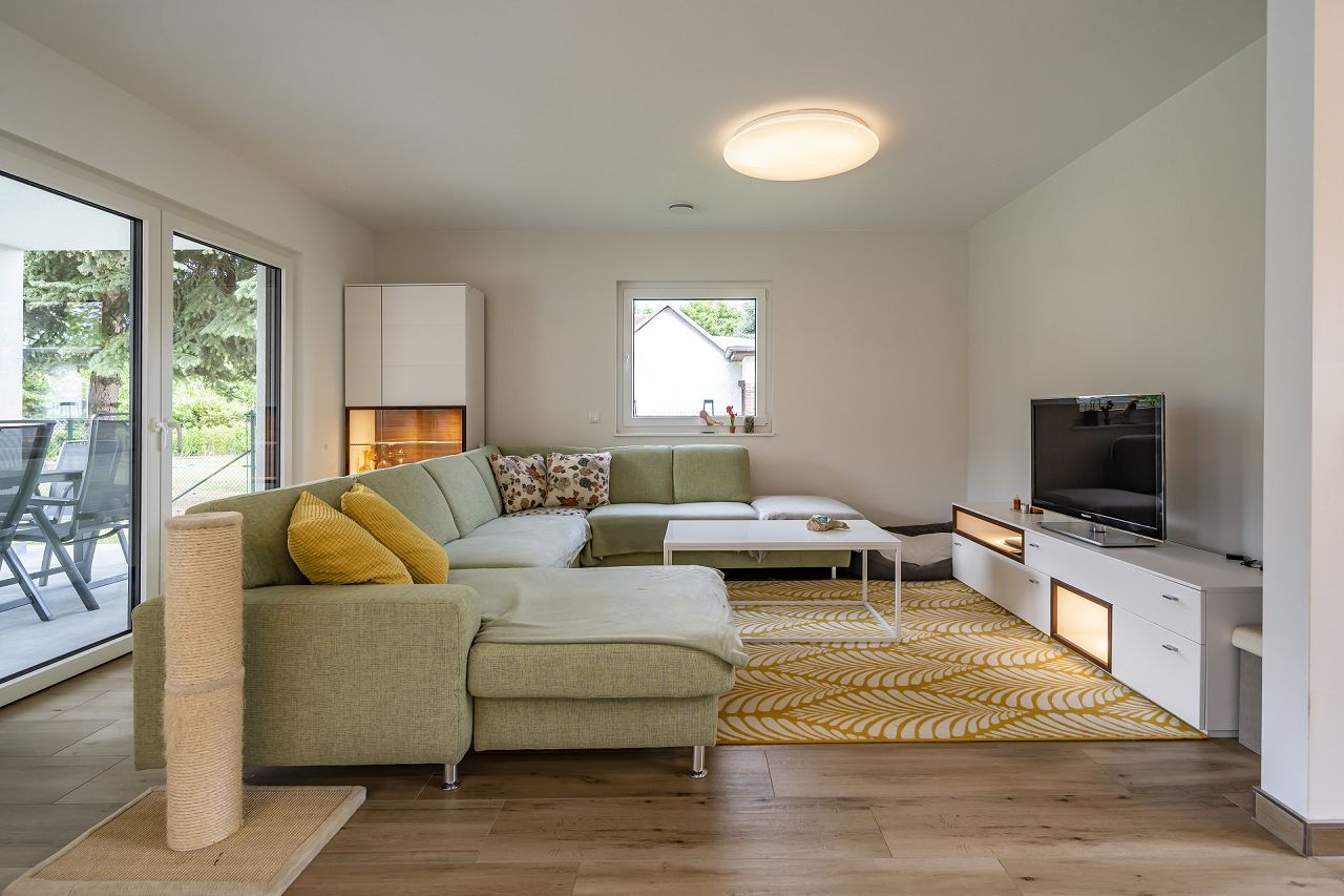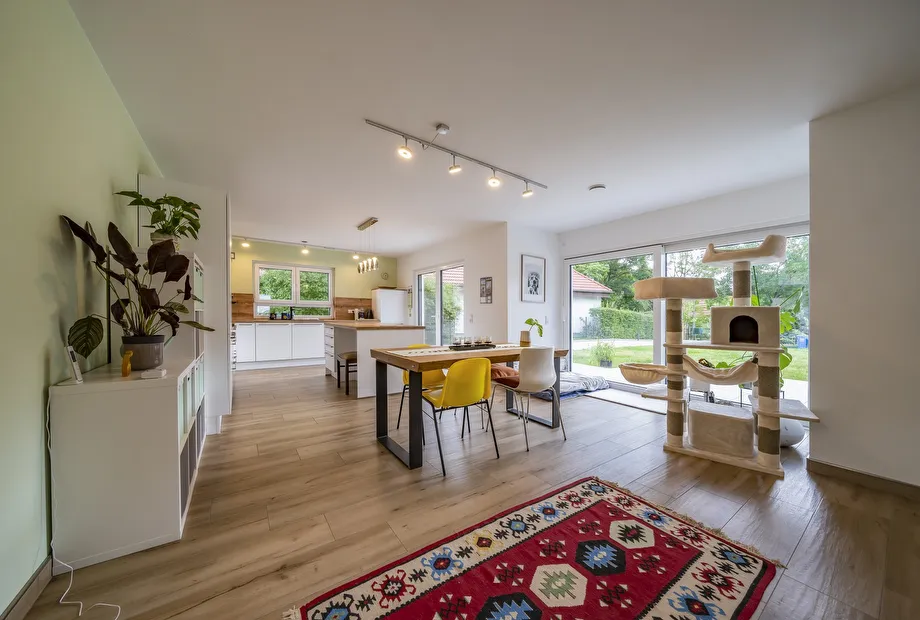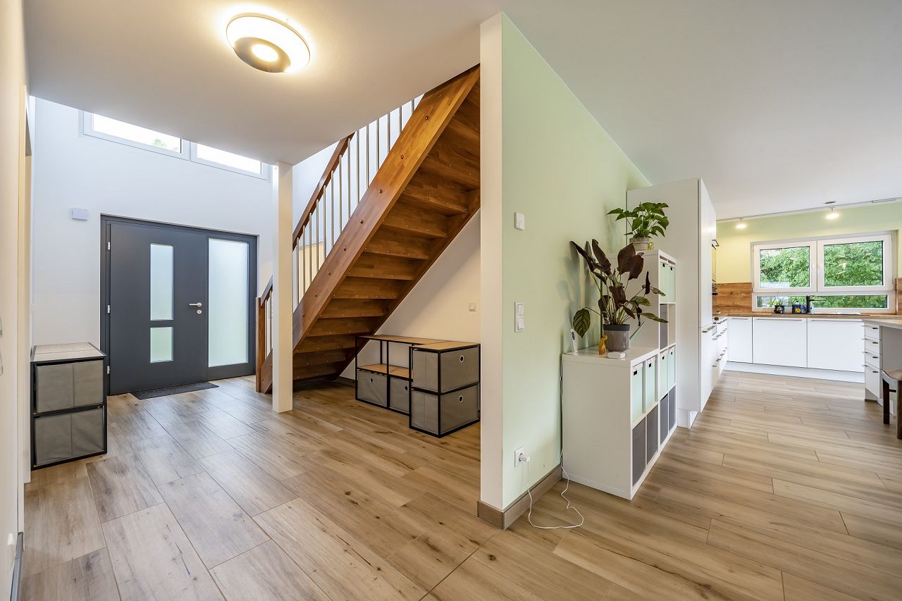 Das STREIF-Kundenhaus ist als Effizienzhaus 40 Plus realisiert worden. Für ein gutes Raumklima sorgen eine effiziente Luft-Wasser-Wärmepumpe mit Fußbodenheizung und eine Lüftungsanlage mit Wärmerückgewinnung. Der Strom, der für den Betrieb der Wärmepumpe benötigt wird, wird zum Teil über eine Photovoltaikanlage selbst erzeugt. Ein Batteriespeicher bietet den Komfort, dass die überschüssige Energie auch zu einem späteren Zeitpunkt abgerufen werden kann. Die Baufamilie hat sich auch für eine Wallbox entschieden. So kann zum Beispiel der erzeugte Strom auch für das Laden eines Elektroautos verwendet werden.
