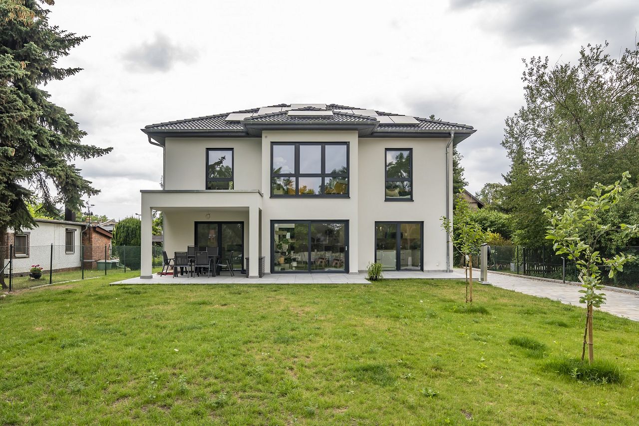 Die Hausarchitektur ist im Stil einer modernen Stadtvilla gestaltet. Die Gartenseite präsentiert sich mit einem Erker und einer überdachten Terrasse. Alle Fenster an der Gartenseite sind bodentief angelegt und sorgen für lichterfüllte Räume. Eine große Panorama-Hebeschiebetür gibt den Blick in den schönen Garten frei und lässt das Drinnen mit dem Draußen verschmelzen. An der Frontseite ist der Eingangsbereich repräsentativ angelegt.