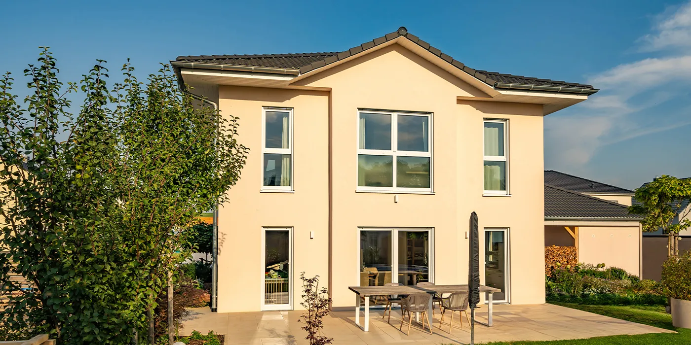 Die Architektur der Stadtvilla mit Zeltdach wird an der Gartenseite von einem Zwerchgiebel mit einem Satteldach geprägt. Ein apricotfarbener Außenputz (RAL 16096) und weiße Fester bringen einen mediterranen Stil ins Haus. Baufamilie Holey hat für das Obergeschoss auch bodentiefe Fenster mit einer festverglasten Brüstung ausgewählt, die sehr repräsentativ wirken. Der Dachüberstand wurde ebenfalls in Weiß gestaltet. Eine anthrazitfarbene Haustür mit Seitenteil ist eine willkommene Abwechslung. Dem Haus angefügt ist eine Garage mit Carport, die ebenfalls mit einem Zeltdach versehen ist und in Design und Ausführung der Stadtvilla entspricht.