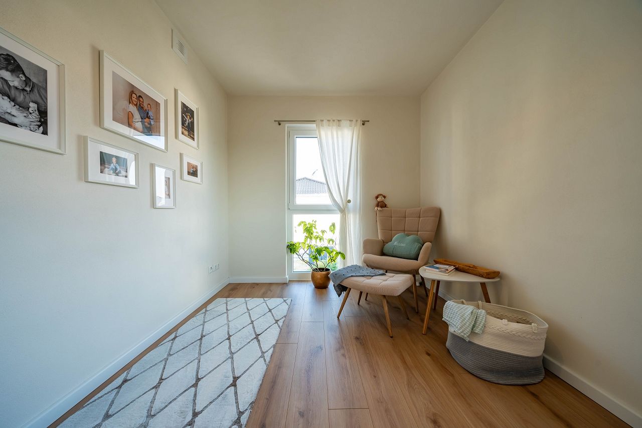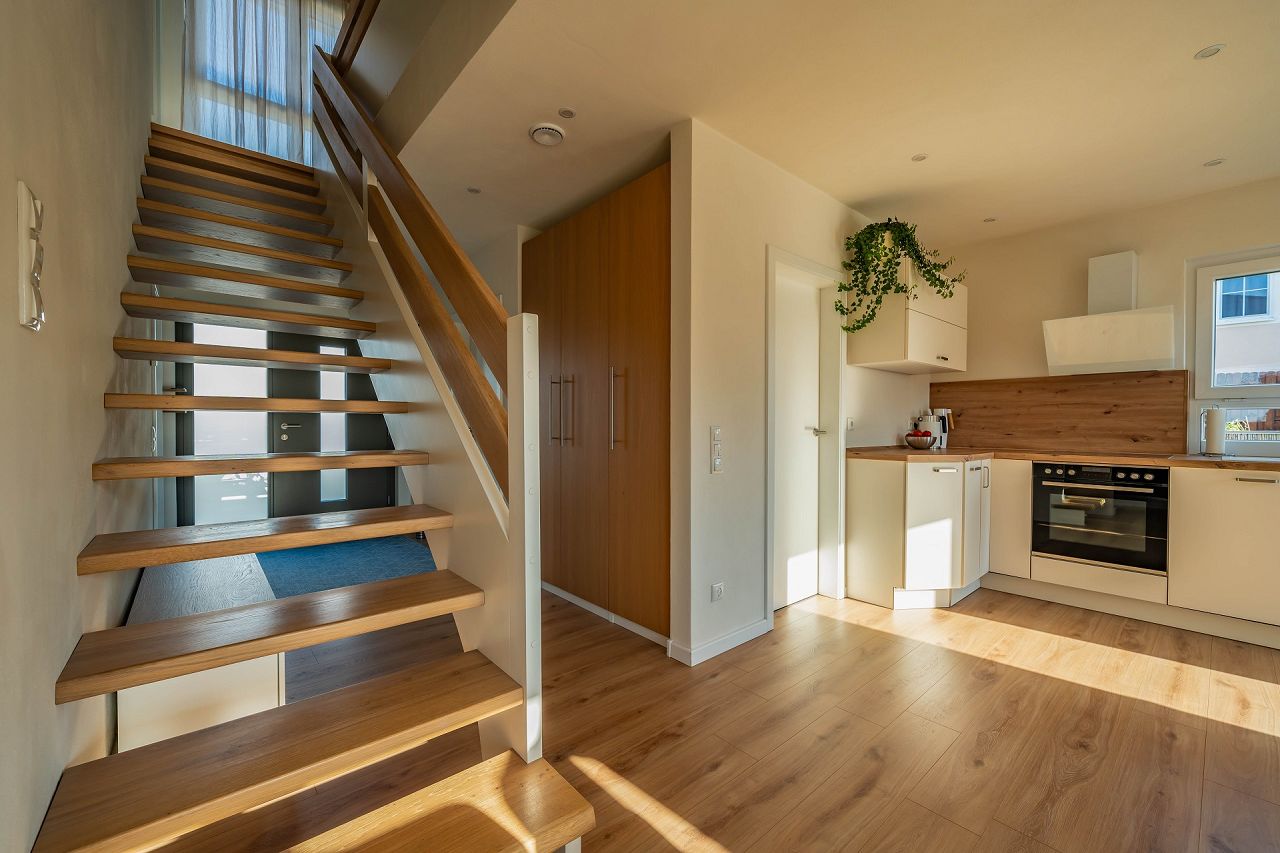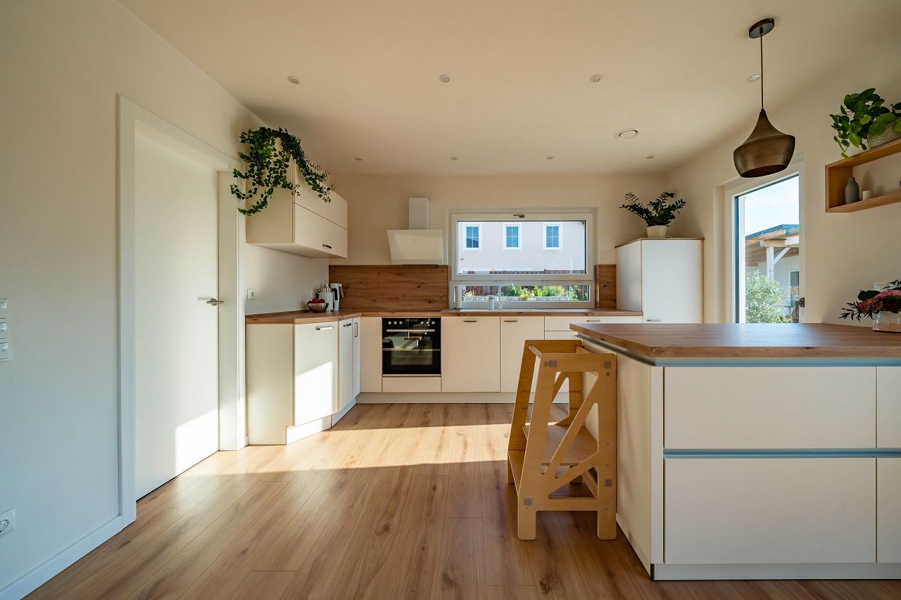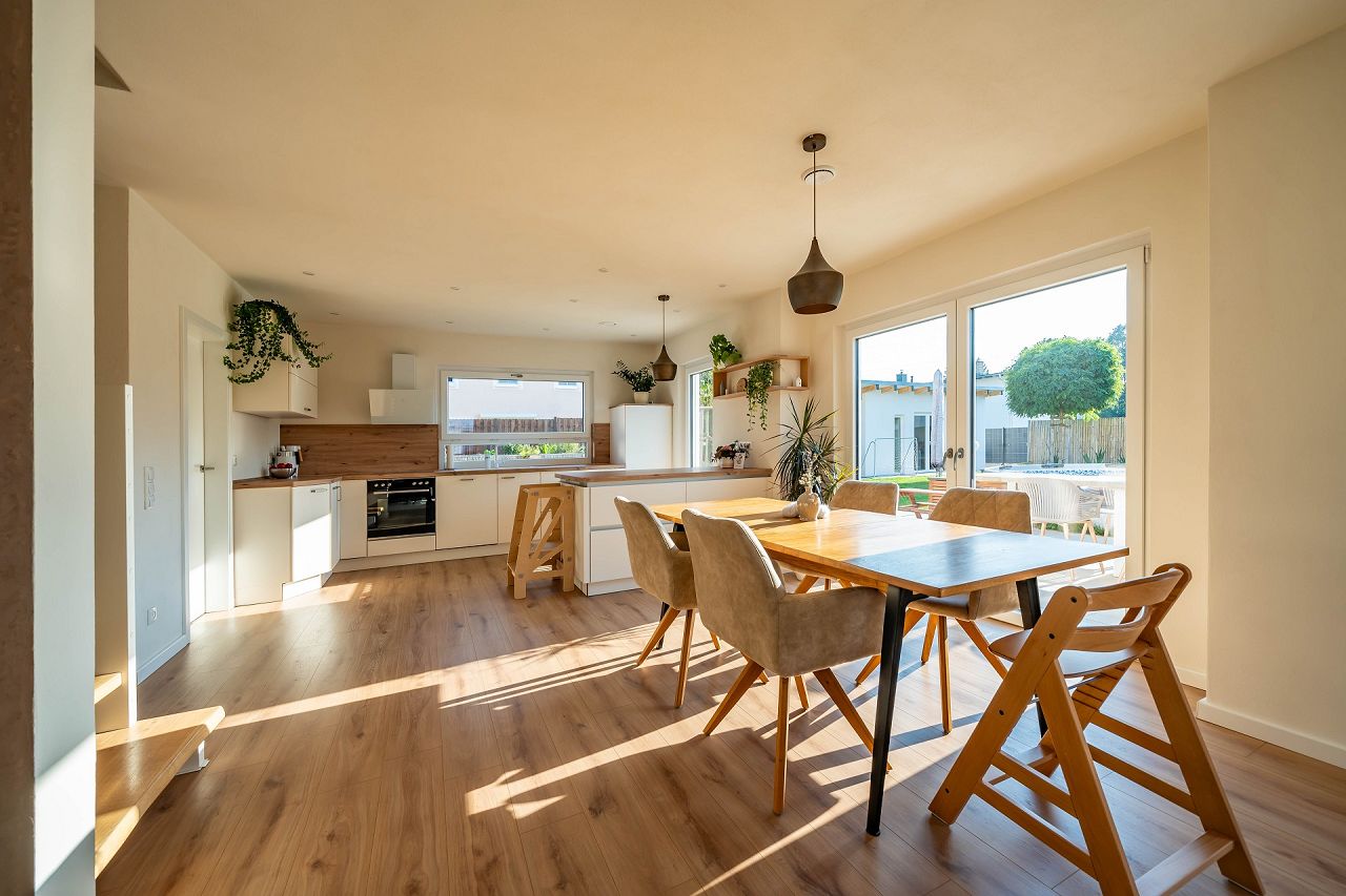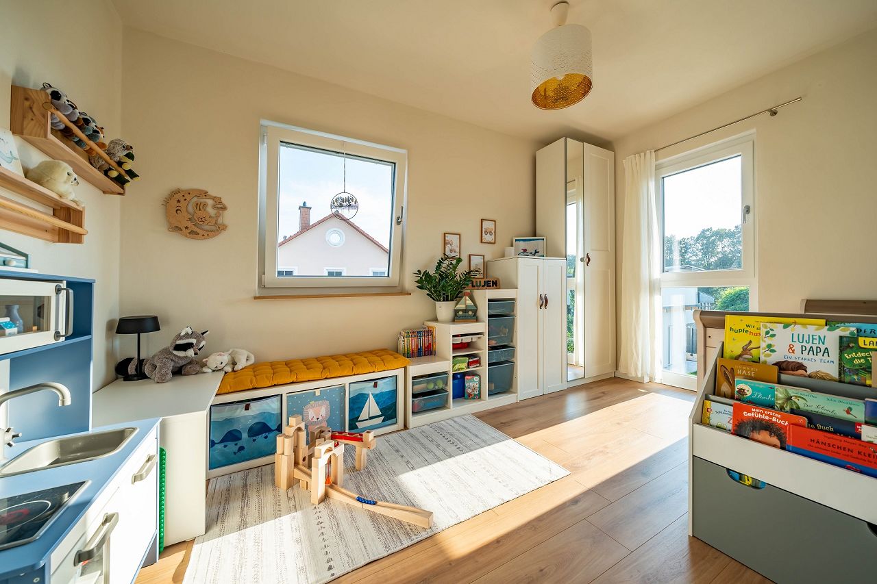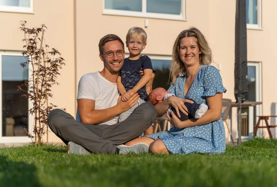 „Der individuelle, an unsere Bedürfnisse angepasste Grundriss. Auch der Erker und die lichtdurchfluteten Räume lieben wir. Für uns war auch das Gefühl wichtig, dass hier mit nachhaltigen Baumaterialien gearbeitet wird und wir ein energieeffizientes Zuhause im KfW 40 Standard haben. Besonders ist auch das Lüftungssystem in allen Räumen und das damit verbundene sehr angenehme Raumklima zu nennen.“