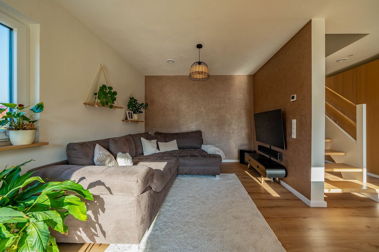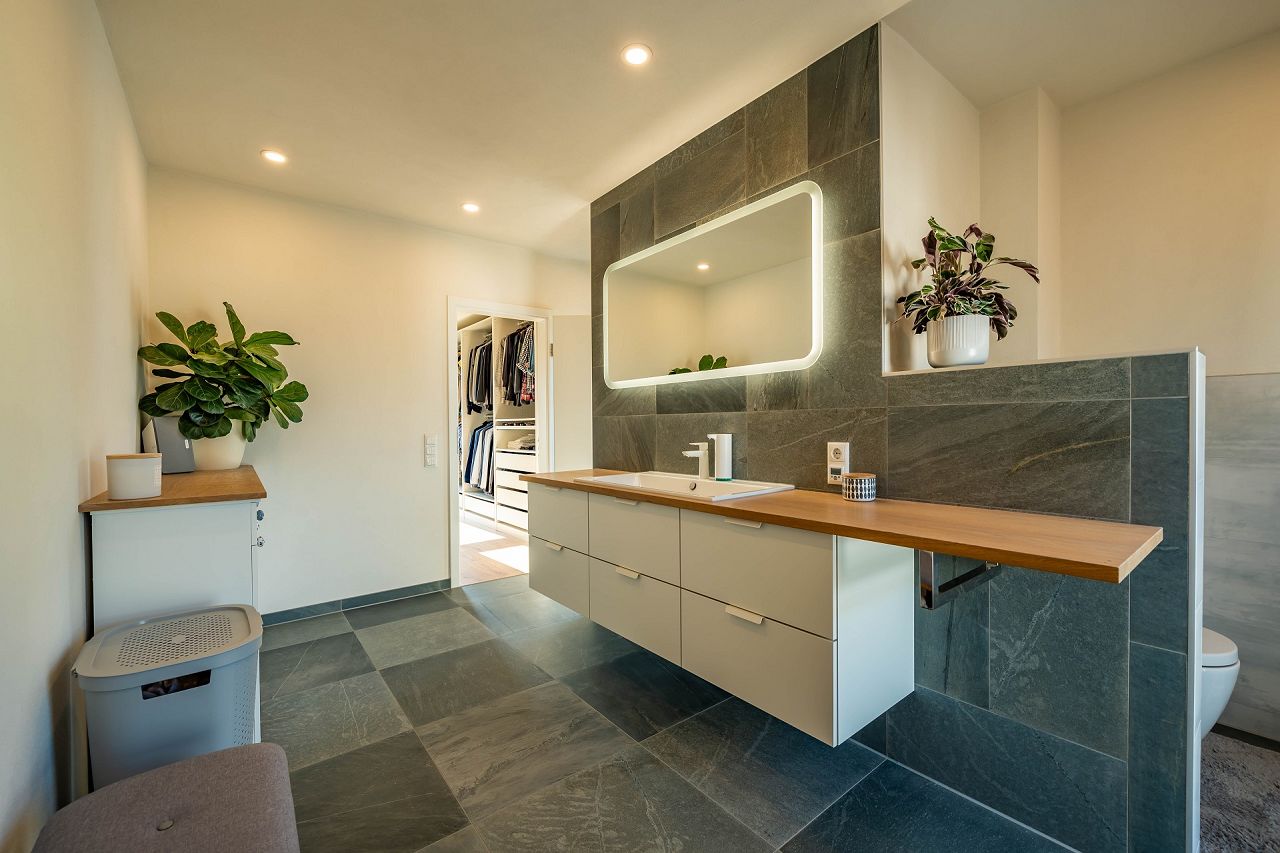 Das neue Zuhause von Familie Holey ist lichterfüllt und in besonderer Weise behaglich. Im Wohn-/Ess- und Kochbereich ist ein Dielenboden in Eiche eingezogen, der mit der Sonne um die Wette strahlt. Eine geradläufige Treppe mit Trittstufen in Eiche und einem Geländer in weiß lasiertem Holz mit einer Kombination von Eiche Natur bringen Modernität ins Wohnen. Die Treppe dient als Raumteiler und setzt den TV-Lounge-Wohnbereich ab. Sehr gut zur Treppe passt die Küche mit den weißen Küchenfronten und weiße Zimmertüren sowie weiße Fenster/Terrassentüren. Die Garderobennische wurde mit Türelementen in Eiche verschlossen. Somit sieht der Empfangsbereich mit der Diele immer sauber und aufgeräumt aus. Die Ausstattung der Bäder wurde ebenfalls mit Fliesen im mediterranen Look ausgewählt. Bronzefarbene Armaturen setzen einen besonderen Akzent. Die Trennwand im Bad wurde mit einer Nische geplant, die mit Regalbrettern versehen zu einem optischen Highlight mit viel Platz für Badutensilien wurde. Im Obergeschoss sind ebenfalls Eichendielen als Bodenbelag ausgewählt. Der Stil der Ausstattung und des Interieurs zieht sich durch alle Räume durch und vermittelt den Eindruck eines durchdachten Konzeptes.