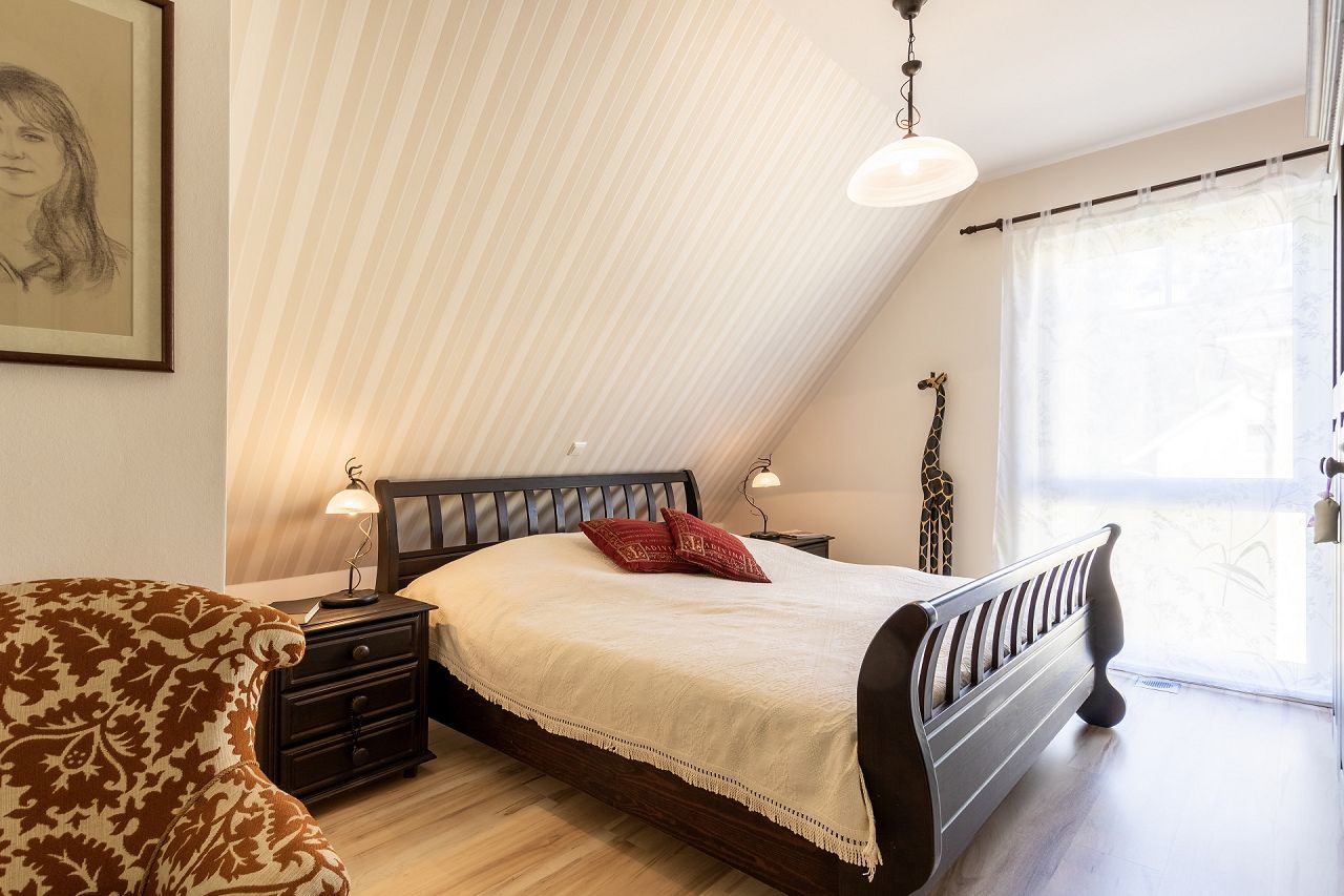 Im Erdgeschoss befinden sich neben dem großzügigen Wohn- und Esszimmer mit Kaminofen, die gewünschte Wohnküche, das Gästezimmer, ein Duschbad und die Diele. Neben der Küche ist ein praktischer Hauswirtschafts- und Haustechnikraum gelegen, der vom Carport aus direkt über eine separate Tür betreten werden kann. Die Einkäufe gelangen auf kürzestem Weg direkt an Ort und Stelle. Zwischen Wohnküche und Wohnzimmer wurde eine Schiebetür eingeplant. Das bietet den Vorteil, dass die Küche eigentlich offen zum Ess- und Wohnbereich ist, aber bei Bedarf eben auch geschlossen werden kann. Im Obergeschoss des Friesenhauses befinden sich die Zimmer für die Zwillinge, ein Elternschlafzimmer mit Ankleide und ein großes, familienfreundliches Bad mit Eckdusche und Eckbadewanne. Ein Glasausschnitt in der Badezimmertür bringt zusätzliches Licht in den Flurbereich. Im Elternschlafzimmer wurde neben der Ankleide auch eine Nische für einen großen Kleiderschrank eingeplant. Der Dachboden verfügt über ein Fenster und ist als Speicher nutzbar. Auch an die Lebensphase im Alter hat das Ehepaar bereits gedacht. Das Vorhandensein des Gästezimmers und des Duschbades im Erdgeschoss ermöglichen dem Paar im Alter das Wohnen auf einer Etage.