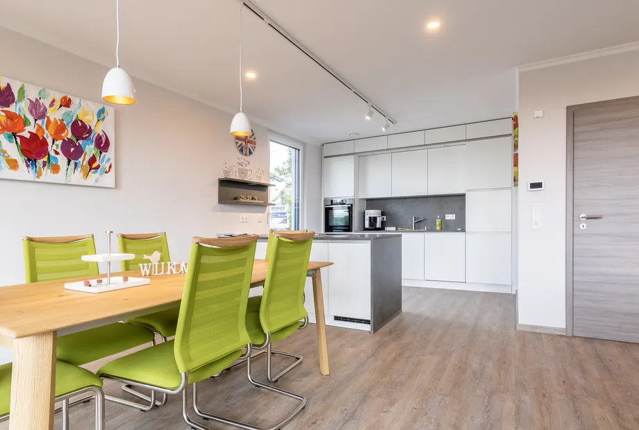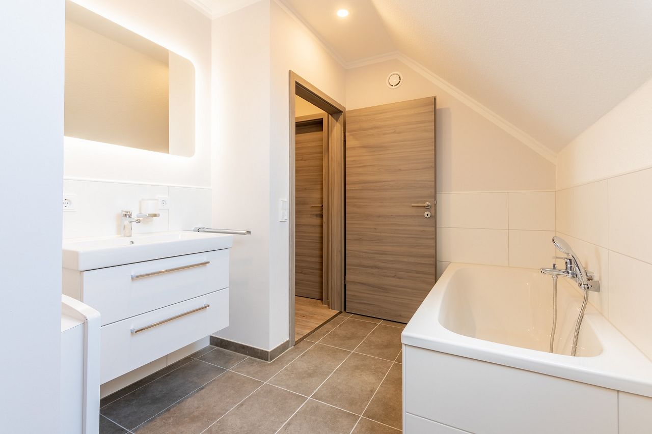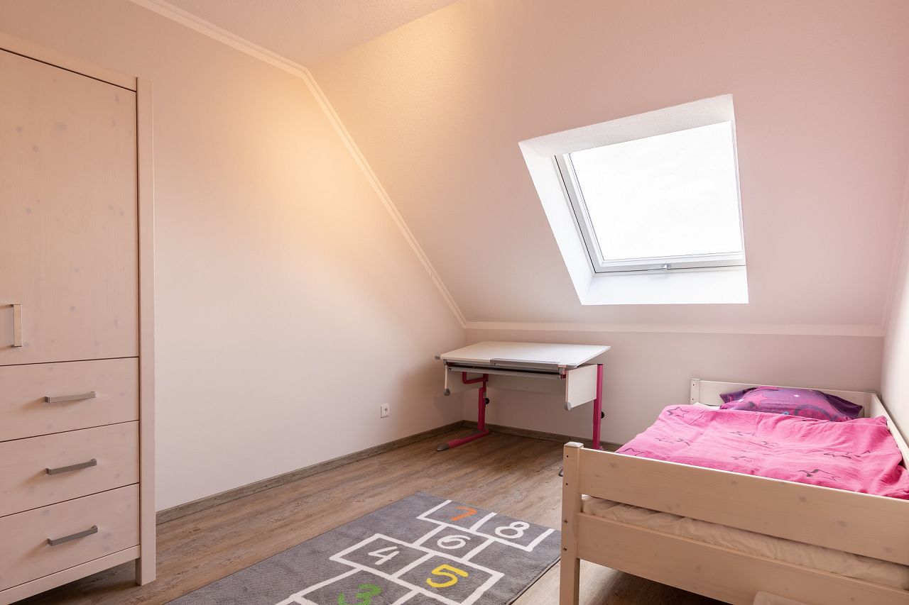 Die Doppelhaushälfte bietet im Erdgeschoss auf 39 m² Platz für einen großen Wohn- und Essbereich mit offener Küchengestaltung. Der Wohnbereich öffnet sich mit vier bodentiefen Fensterelementen zur Terrasse und zum Garten hin und sorgt dafür, dass das Erdgeschoss hell und lichtdurchflutet ist. Neben dem Flur mit integrierter Garderobe und dem Treppenhaus, wird das Erdgeschoss von einem Duschbad mit ebenerdiger Glasdusche, einem praktischen Abstellraum und einem Hauswirtschafts- und Haustechnikraum ergänzt. Die Grundfläche der Doppelhaushälfte beträgt 63 m². Im Dachgeschoss sind ein Elternschlafzimmer und zwei Kinderzimmer, ein Abstellraum bzw. begehbarer Kleiderschrank und ein familienfreundliches Bad untergebracht. Die Doppelhaushälfte verfügt über zwei PKW-Stellplätze.