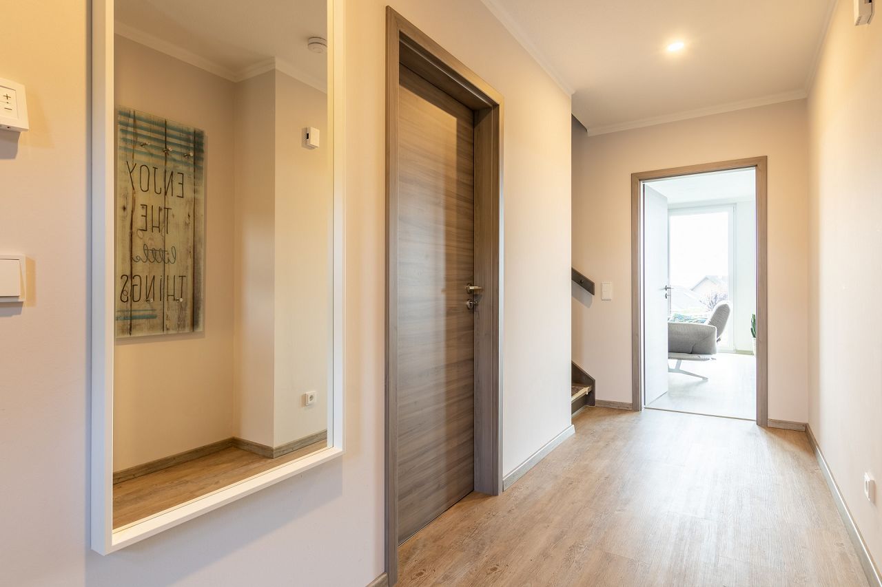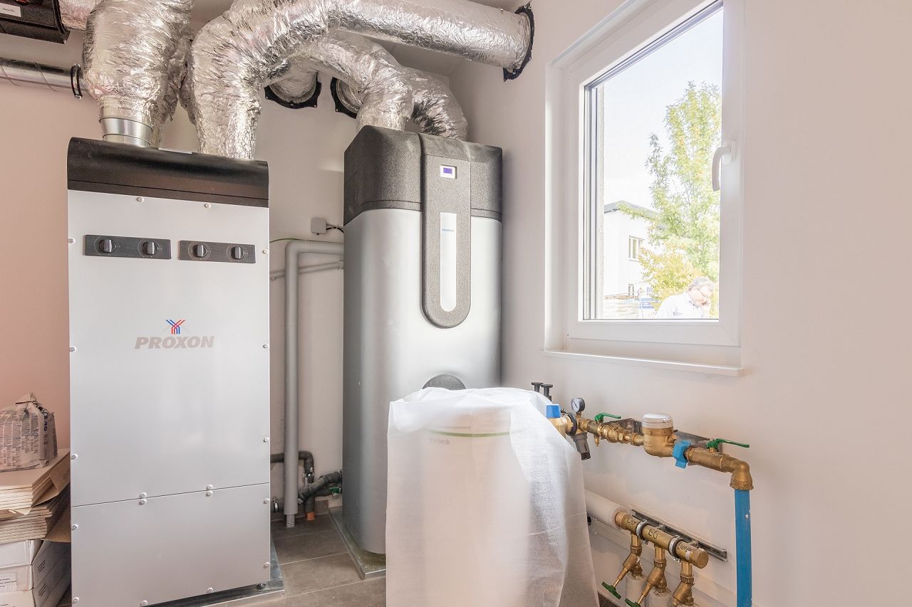 Die Doppelhaushälfte verfügt mit der STREIF-Luft-Luft-Wärmepumpen-Technologie über eine innovative Haustechnik. Das System vereint eine Heizungs- und eine Lüftungsanlage in einem Gerät und ist im Haustechnik- und Hauswirtschaftsraum im Erdgeschoss des Hauses untergebracht. Auf dem Dach wurde für die Stromerzeugung eine Photovoltaikanlage installiert. Die Anlage verfügt über einen Batteriespeicher, wo der erzeugte Strom zwischengespeichert werden kann. Zuviel erzeugter Strom, der nicht für den Eigenbedarf benötigt wird, kann in das öffentliche Stromnetz eingespeist werden.