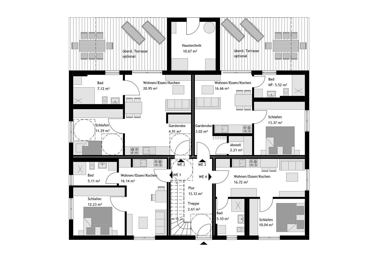 Im Erker des Mehrfamilienhauses ist im Erdgeschoss ein Haustechnikraum mit Zugang von außen geplant. Im Obergeschoss ist an dieser Stelle ein Schlafraum geplant. Durch den Erker bildet sich eine perfekte, äußere räumliche Trennung der Wohneinheiten. So werden die Terrassen und optionalen Balkone zu beschützenden Rückzugsorten. Eine der acht Wohneinheiten bietet 2 Schlafräume, alle anderen Wohneinheiten bieten 1 Schlafraum, 1 Bad, und einen Wohn-, Ess- und Kochbereich. Eine barrierearme Planung der Wohneinheiten im Erdgeschoss ist möglich.