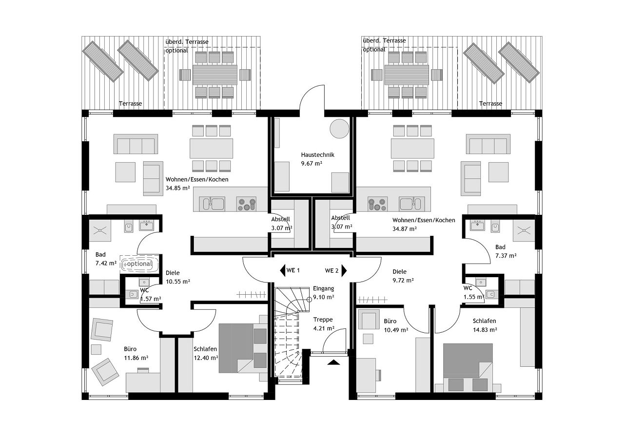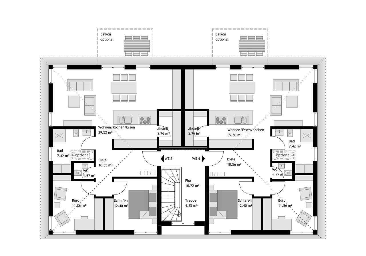 Die Grundrisse sind geeignet für Singles, Paare oder eine Kleinfamilie. Die Wohneinheiten sind nahezu identisch in der Größe angelegt. Bei mehreren Bauparteien lassen sich die Kosten so einfacher verteilen. Grundsätzlich kann die Grundrissgestaltung und die Ausstattung jedoch individuell, nach den Bedürfnissen der Baupartner/Investoren erfolgen.