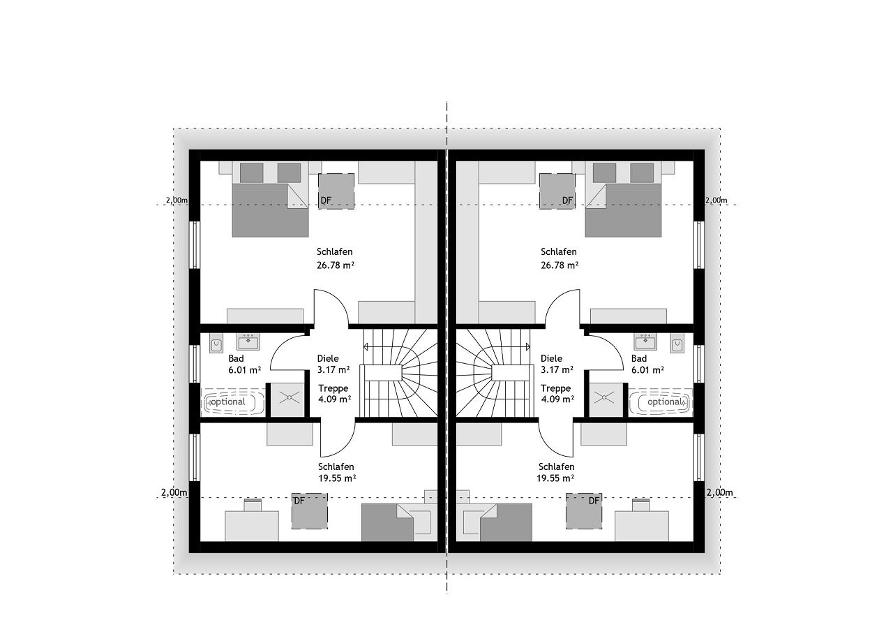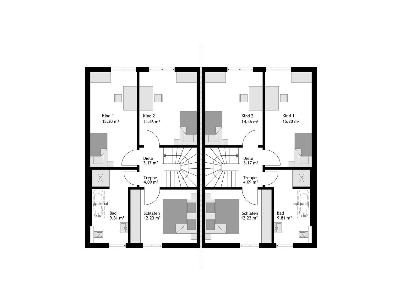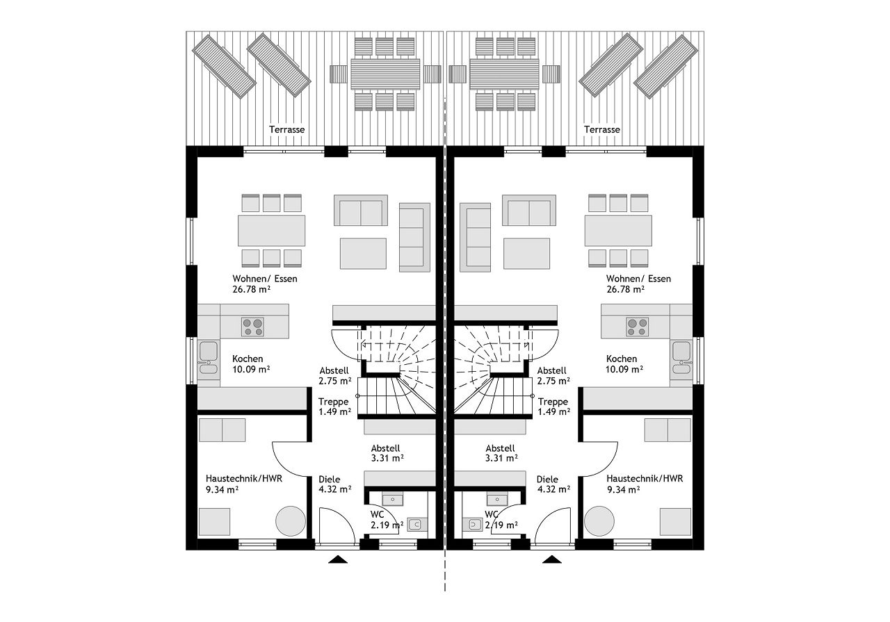 Die Planung ist besonders für schmale Grundstücke geeignet. Die beiden Doppelhaushälften werden mit der speziellen STREIF-Gebäudetrennwand ausgeführt. Besonders schön sind die großformatigen Fenster und Terrassentüren zur Gartenseite hin. Die Grundrissgestaltung bietet im Erdgeschoss einen sehr gut proportionierten und optimierten Grundriss. Der große Wohn-, Essbereich bietet auf 26,78 m² Platz. Der 10,09 m² große Küchenbereich kann in U-Form mit einer Kochtheke ausgeführt werden. In der Diele ist ein „versteckter Bereich“ geplant, indem die komplette Garderobe verschwinden kann. Mit einer schönen Diele, dem Treppenhaus, dem Gäste-WC und dem Haustechnik-/Hauswirtschaftsraum ist das Raumangebot im Erdgeschoss komplett. In den Obergeschossen der Doppelhaushälften sieht das Raumangebot 3 Schlafräume und ein Familienbad vor. Im Dachgeschoss könnte ein Studio oder ein separater Elternbereich seinen Platz finden. Mit zwei großen Zimmern und einem Bad ist hier viele möglich. Das Raumkonzept bietet also Platz für eine große Familie oder alternativ für entsprechende Büro-, Hobby- oder Gästezimmer.