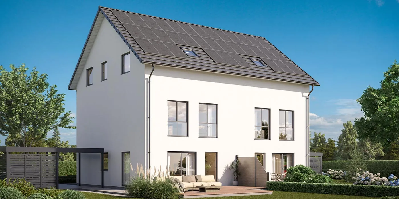 Für schmale Grundstücke besonders geeeignet: Das 2,5-geschossige Doppelhaus mit einem klassischen Satteldach bietet außergewöhnlich viel Platz mit 179 m² je Doppelhaushälfte.