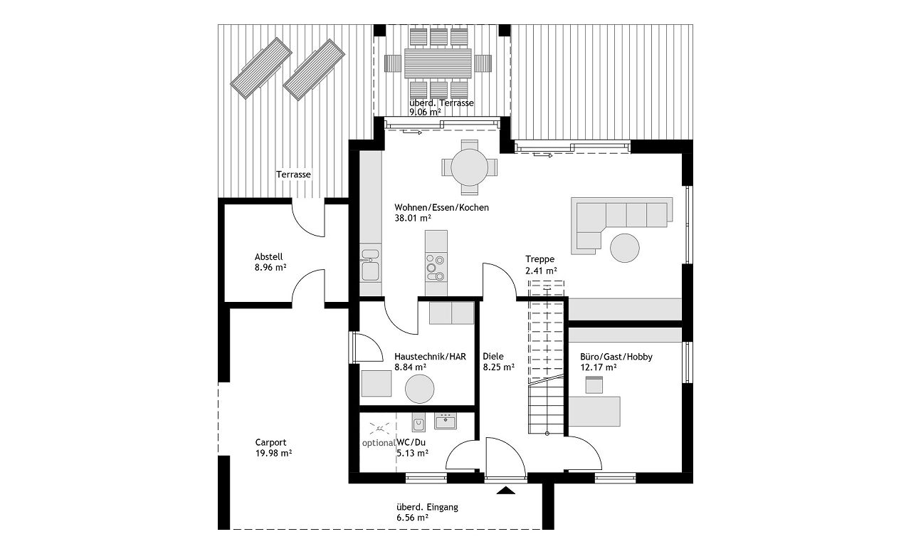 Die Architektur des Stadthauses bietet auf einer kompakten Grundfläche zahlreiche Highlights. Der repräsentative Wohn-/Ess- und Kochbereich wird durch eine Wohnraumerweiterung ergänzt und ist mit einem überdachten Terrassenbereich ausgestattet. Die Überdachung ist nicht nur optisch eine Aufwertung des Gebäudes, sie bietet den Bewohnern Schutz bei jeder Wetterlage.