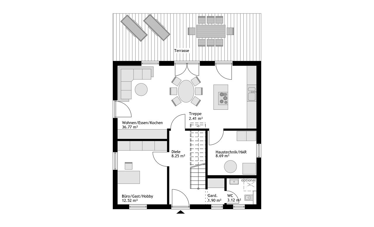 Im Erdgeschoss befinden sich ein großer Wohn-/Essbereich mit offen gestalteter Küche, ein praktischer Hauswirtschafts-/Haustechnikraum, ein zusätzliches Büro/Gästezimmer, eine Diele und ein Gäste-WC mit einer optional möglichen Dusche.