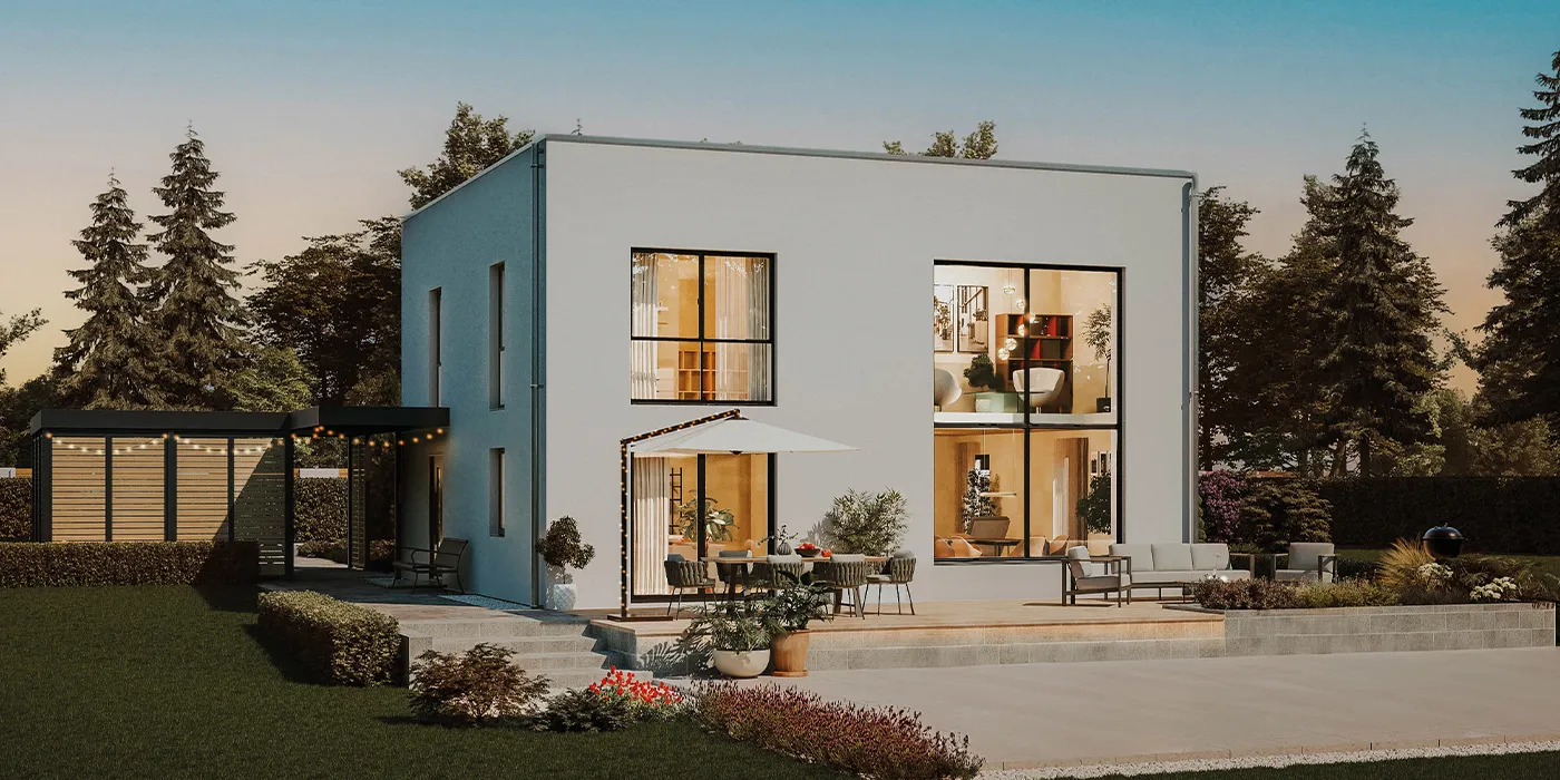 Die exklusive STREIF-Villa 01 bietet in der Architektur ein imposantes 2-geschossiges Panoramafenster (Glasfront) an der Gartenseite. Weitere wichtige Eigenschaften sind ein Flachdach und ein kubistischer Gebäudekörper.