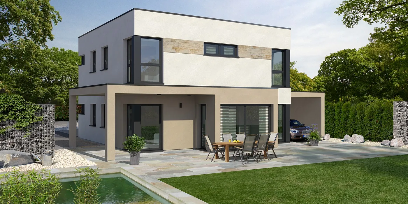 Die Stadtvilla CITY mit Flachdach zeichnet sich durch ihre moderne Architektur aus. Zu den Details gehört unter anderem der überdachte Eingangsbereich, der fließend zum Carport hin verläuft und Fenster, die übereck angeordnet sind. Die Gartenseite des Hauses ist mit Luftbalken gestaltet.