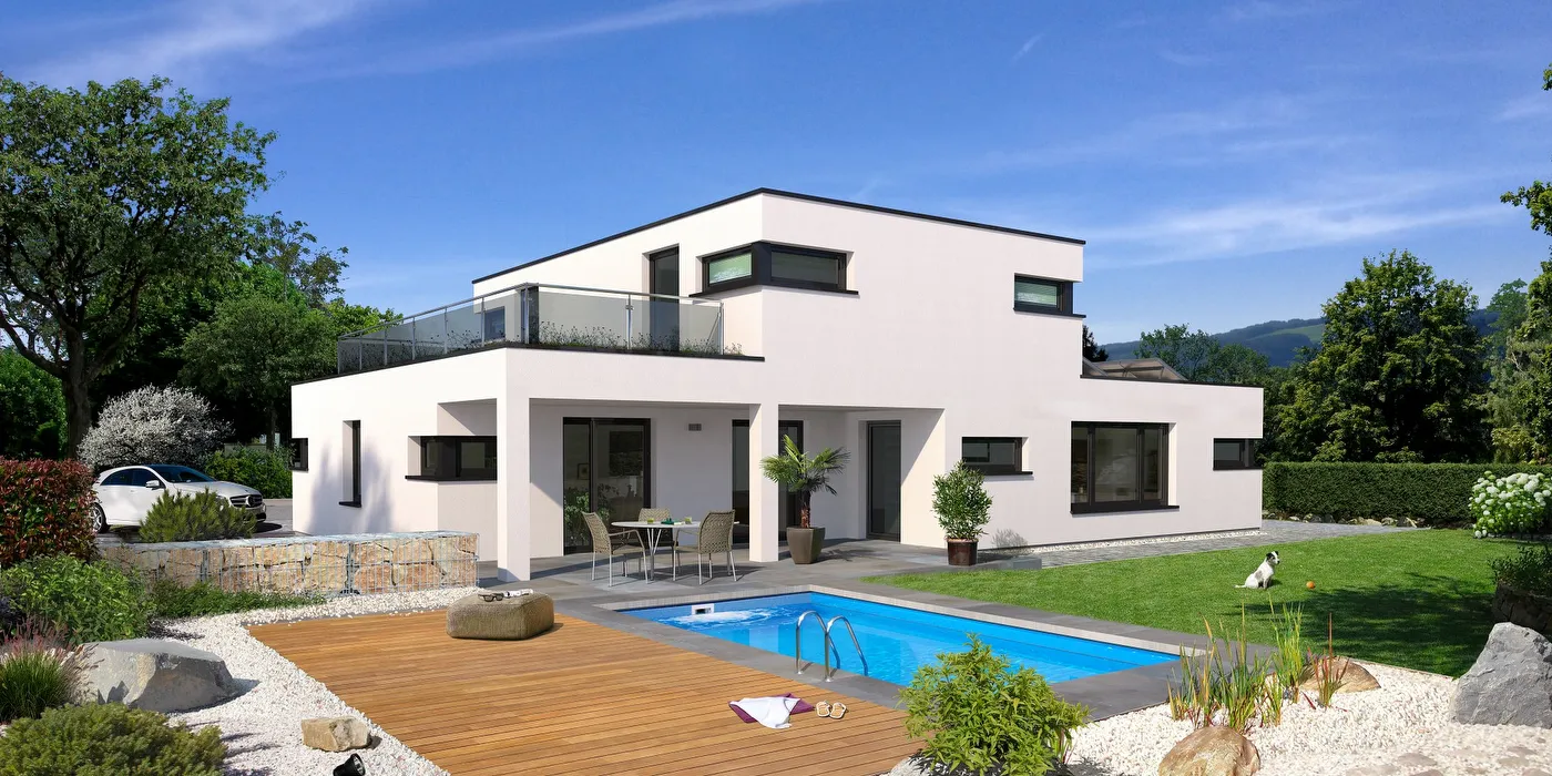 Die Stadtvilla im Bauhausstil überzeugt mit einem Flachdach und drei versetzten Baukörpern, die zum Teil zweigeschossig und zum Teil eingeschossig ausgeführt sind. Die Architektur bietet eine Gestaltung mit Eckfenstern, eine überdachte Terrasse im Erdgeschoss und eine herrliche Dachterrasse im Obergeschoss. Der Grundriss des Hausentwurfes bietet viel Platz für die ganze Familie.