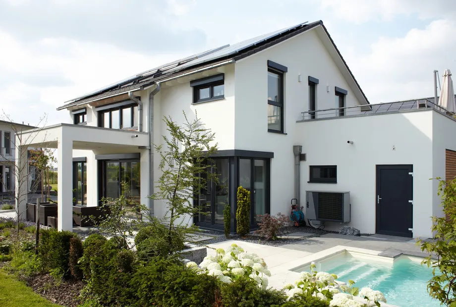 Mit unserem STREIF Musterhaus in Frechen bei Köln erwartet Sie ein hochmodernes Plus-Energie-Haus, das in Sachen Energieeffizienz Maßstäbe setzt. Zu der innovativen Haustechnik gehören eine Luft-Wasser-Wärmepumpe mit Solaranlage und eine Photovoltaikanlage. Dadurch produziert das Haus mehr Energie, als es verbraucht. In Kombination mit hervorragenden Dämmeigenschaften werden die Vorgaben der aktuellen Energieeinsparverordnung wesentlich übertroffen.