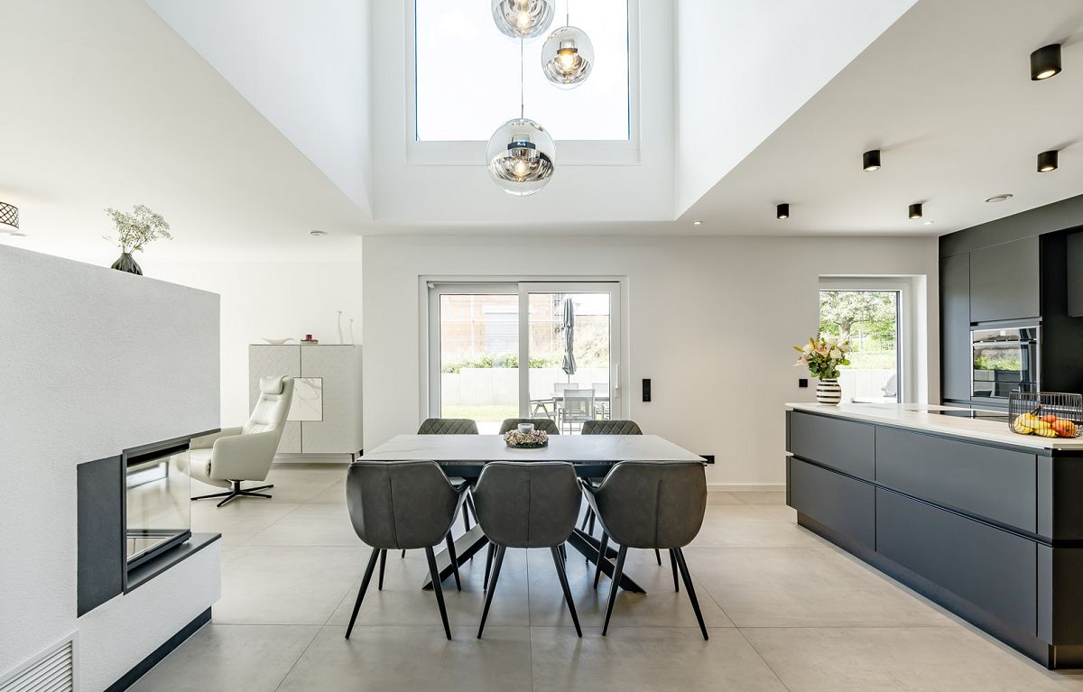 Individuelle Architektur und Sonder- lösungen für Sie. Sonderraumhöhen, 2-geschossige Panoramafenster, Superview-Schiebetürenanlage, Panorama-Sitzfenster, Panorama-Hebeschiebetüren.